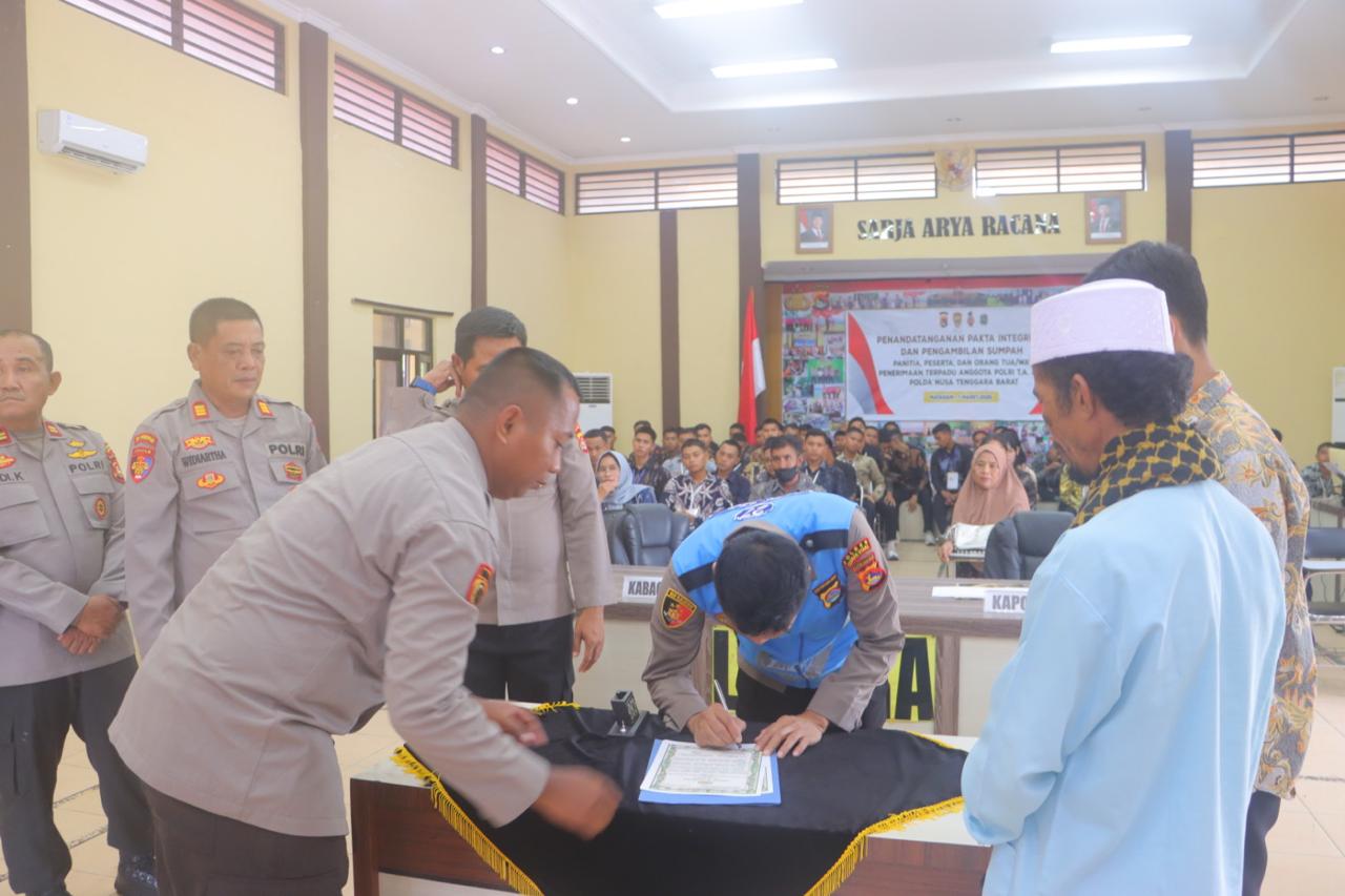 Wakapolda NTB juga menegaskan bahwa tidak ada toleransi terhadap kecurangan berupa kolusi maupun nepotisme. Jika ditemukan hal tersebut, akan dilakukan tindakan tegas baik kepada peserta maupun panitia. Acara dilanjutkan dengan penandatanganan nota pakta integritas antara panitia, peserta, dan orang tua calon peserta anggota Polri.
