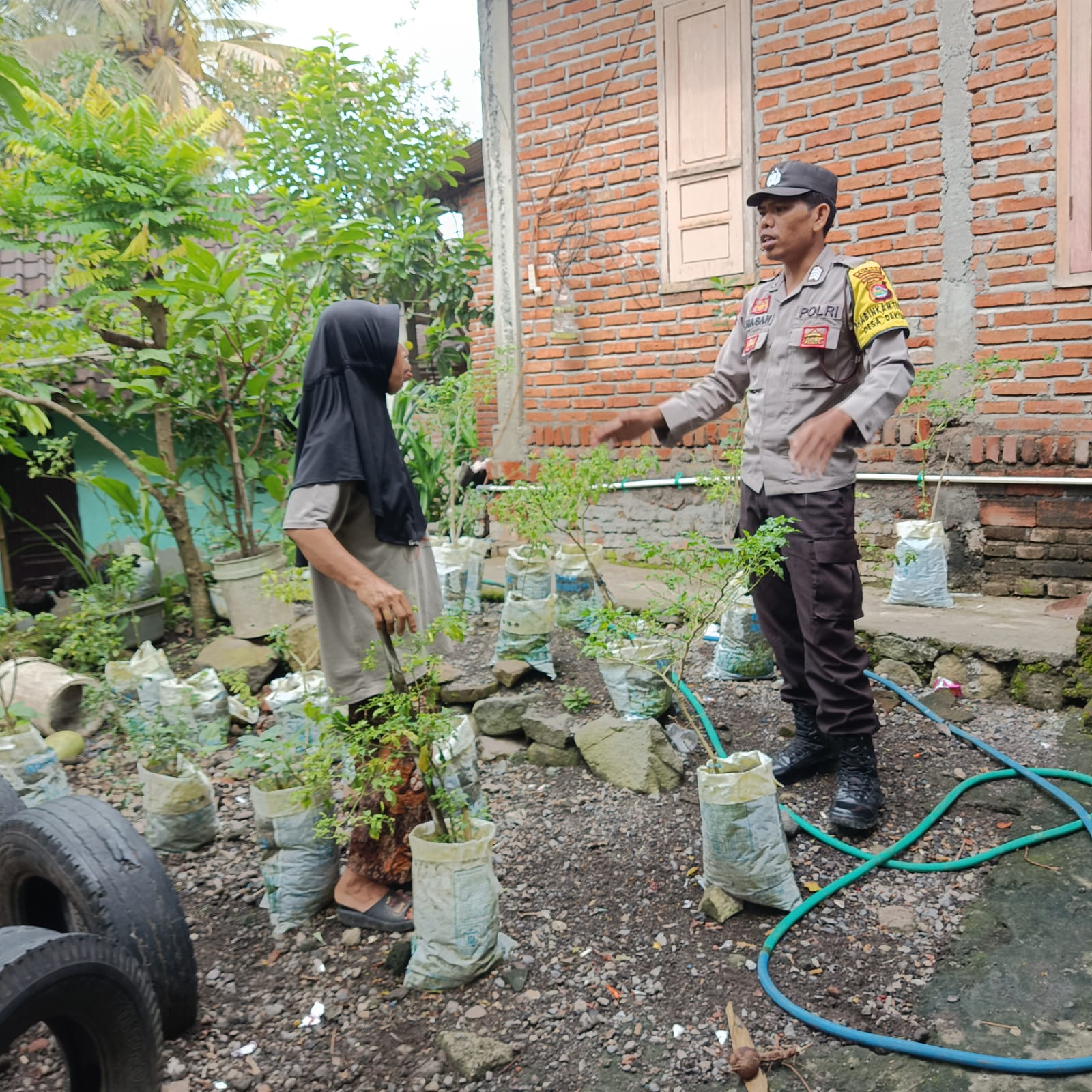Dalam patroli sambang, Personel Polres Lombok Tengah mengajak berkomunikasi warga yang sedang memanfaatkan lahan kosong miliknya untuk dijadikan perkarangan bergizi serta melihat sejauh mana ketahanan pangan di Desa Murbaya, Kecamatan Pringgarata, Kabupaten Lombok Tengah.