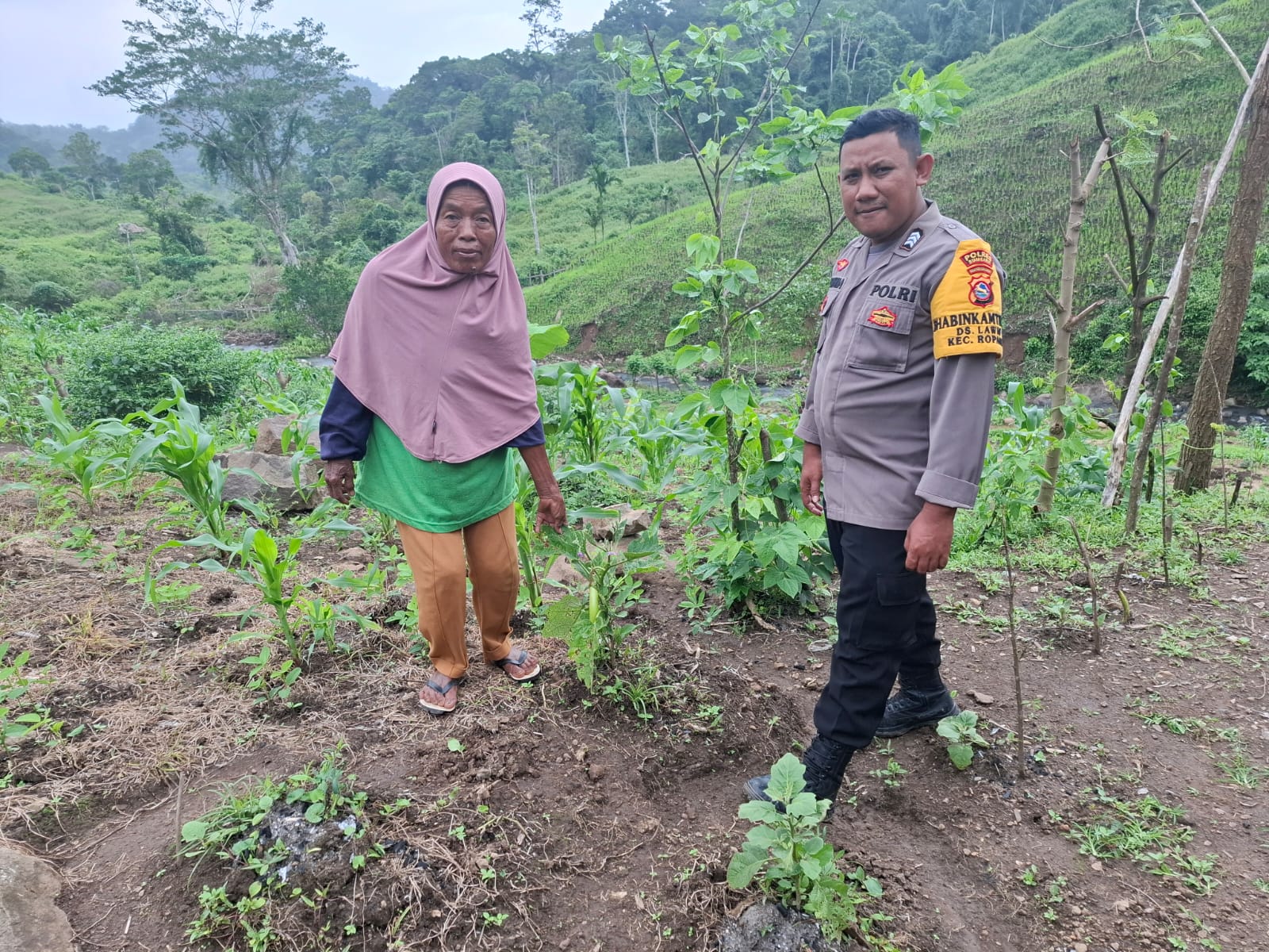 Sumbawa Besar-NTB, Personel Polsek Ropang, Bhabinkamtibmas Desa Lawin Brigadir Nanang Satria melaksanakan kegiatan sambang sekaligus pengecekan perkembangan tanaman padi dan tanaman holtikultura (cabe dan terong) milik Ibu Sri Wahida di Dusun Suri, Desa Lawin, Kecamatan Ropang, Kabupaten Sumbawa, pada Jumat 14 maret 2025.