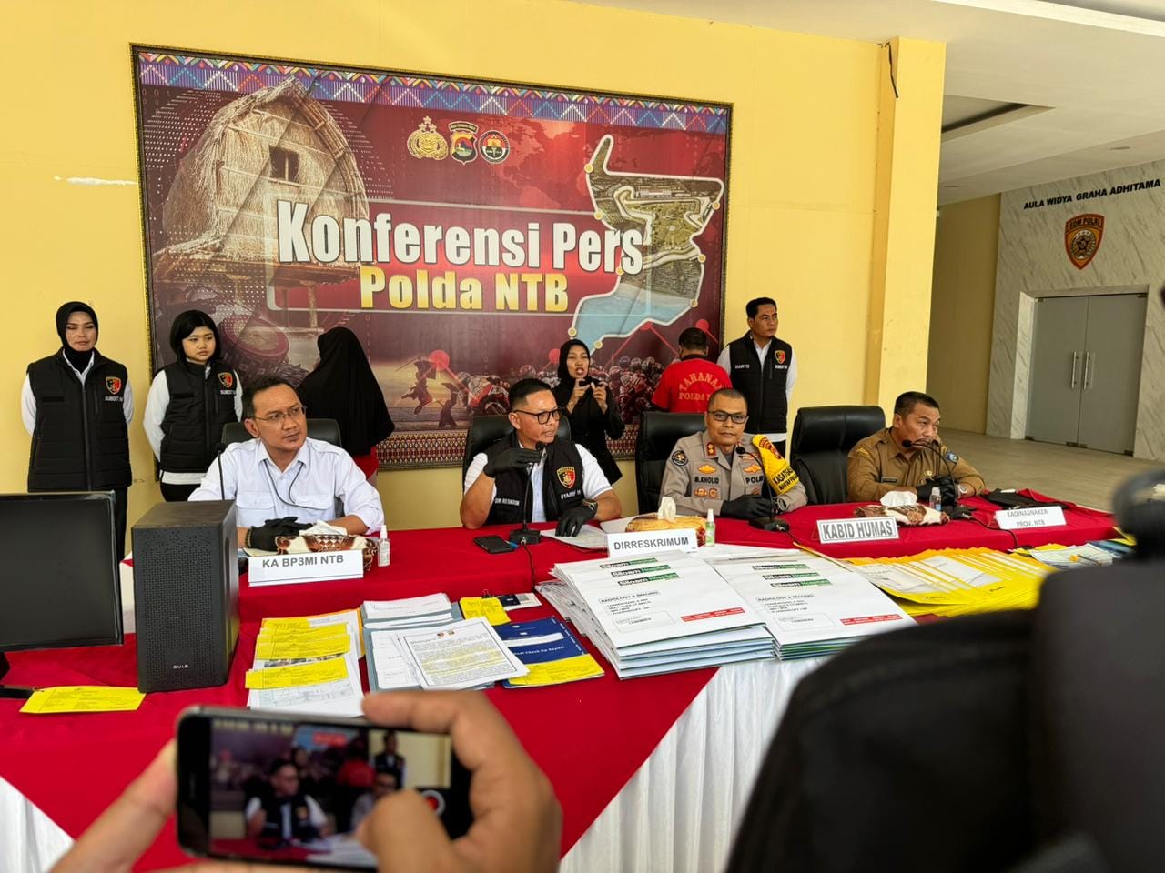 Hadir sekaligus memimpin Konferensi pers Direktur Reskrimum Polda NTB bersama Kabid Humas Polda NTB, Perwakilan Disnakertrans provinsi NTB, Kepala P3MI NTB, para Korban dan Kedua Tersangka.