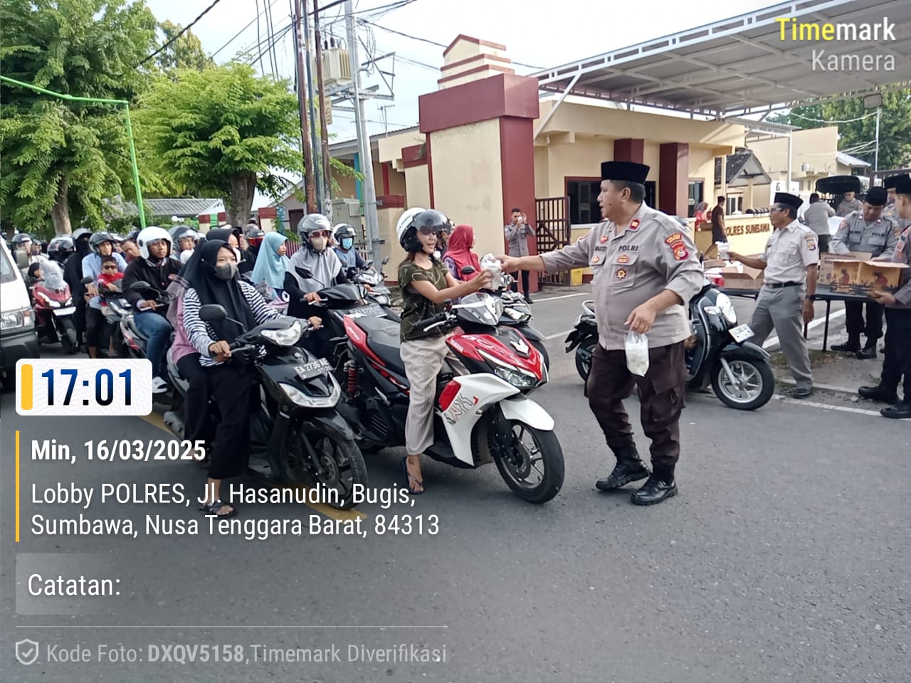 Sumbawa Besar–NTB, Moment penuh berkah, personel Polres Sumbawa yang terdiri dari gabungan satuan fungsi melaksanakan kegiatan sosial dengan membagikan paket takjil gratis kepada masyarakat dan pengendara yang melintas di depan Mapolres Sumbawa, Minggu (16/03/25).
