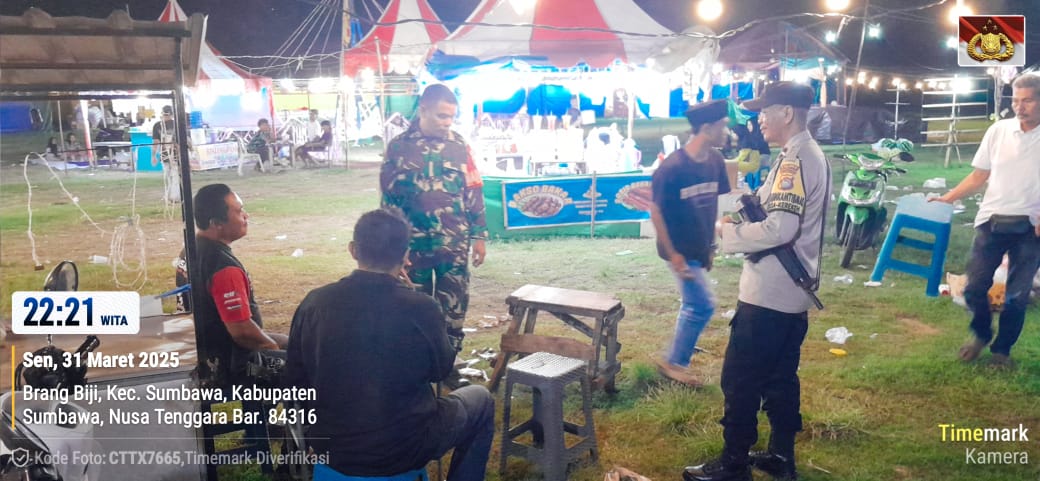 Sumbawa Besar-NTB, Personel gabungan dari Polsek Sumbawa dan Koramil Sumbawa melaksanakan patroli malam bersama di wilayah Kecamatan Sumbawa, Senin (31/03/25)