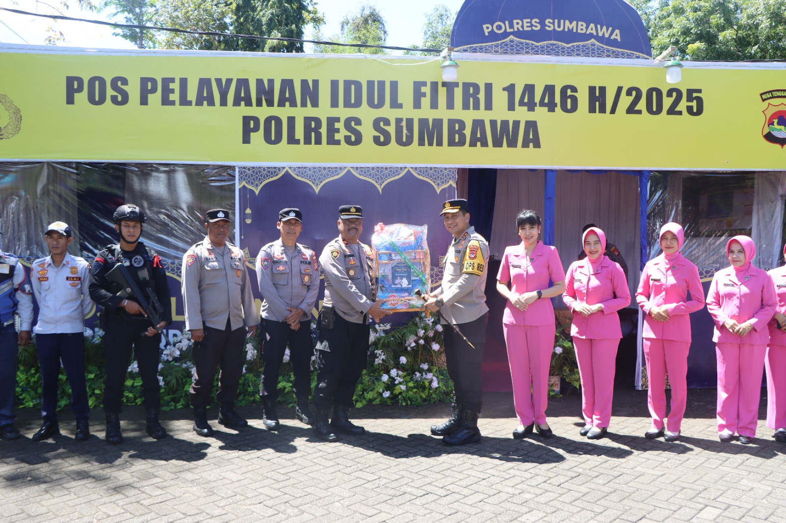 Sumbawa Besar–NTB, Kapolres Sumbawa, AKBP Bagus Nyoman Gede Junaedi SH, S.IK, M.AP., bersama Ketua Bhayangkari Cabang Sumbawa, Ny. Winda Bagus melaksanakan kunjungan ke sejumlah Pos Pam dan Pos Yan yang terlibat dalam Operasi Ketupat Rinjani 2025, Jumat (04/04/25).