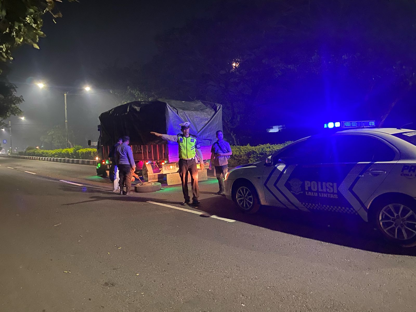 “Kami melihat ada truk yang berhenti di pinggir jalan dengan kondisi ban pecah. Tentu ini bisa membahayakan, baik bagi pengemudi truk itu sendiri maupun pengguna jalan lainnya, terutama di malam hari,” kata Ipda I Wayan Rudi Hariadi.