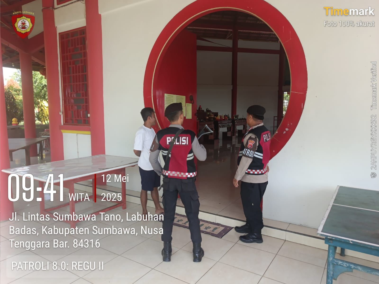 Dengan menggunakan kendaraan patroli dinas R4 (roda empat), anggota Unit Patroli Sat Samapta Polres Sumbawa menyambangi masyarakat yang tengah melaksanakan ibadah di Klenteng Bao An Gong. Patroli ini dilaksanakan sebagai langkah antisipasi terhadap potensi gangguan keamanan dan ketertiban masyarakat (Kamtibmas), serta untuk memberikan rasa aman dan nyaman bagi umat beragama Buddha yang sedang menjalankan ibadahnya.