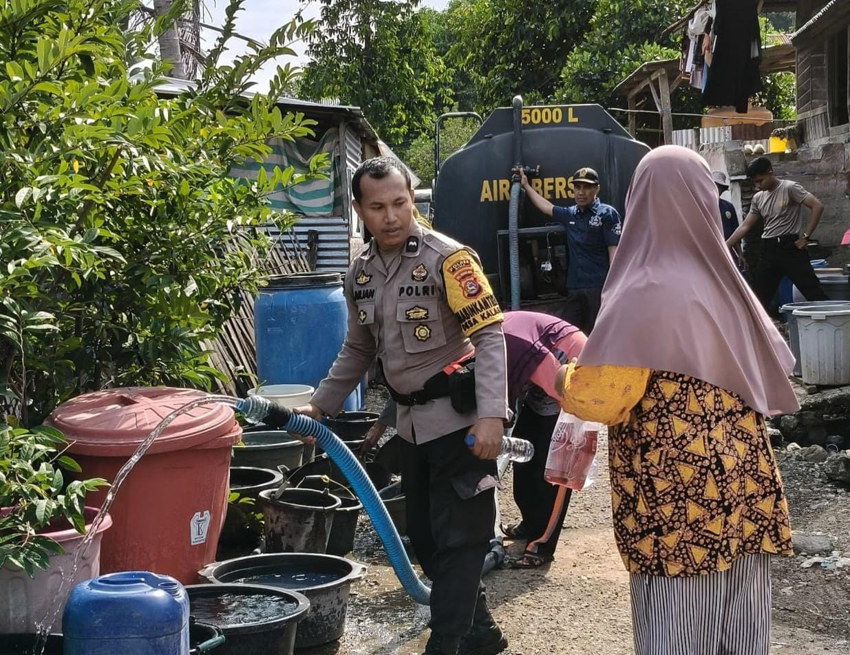 5000 Liter Air Bersih yang angkut menggunakan mobil tangki milik Polres Bima didistribusikan ke Desa Kalampa guna membantu warga yang kesulitan mendapatkan air bersih untuk kebutuhan sehari-hari