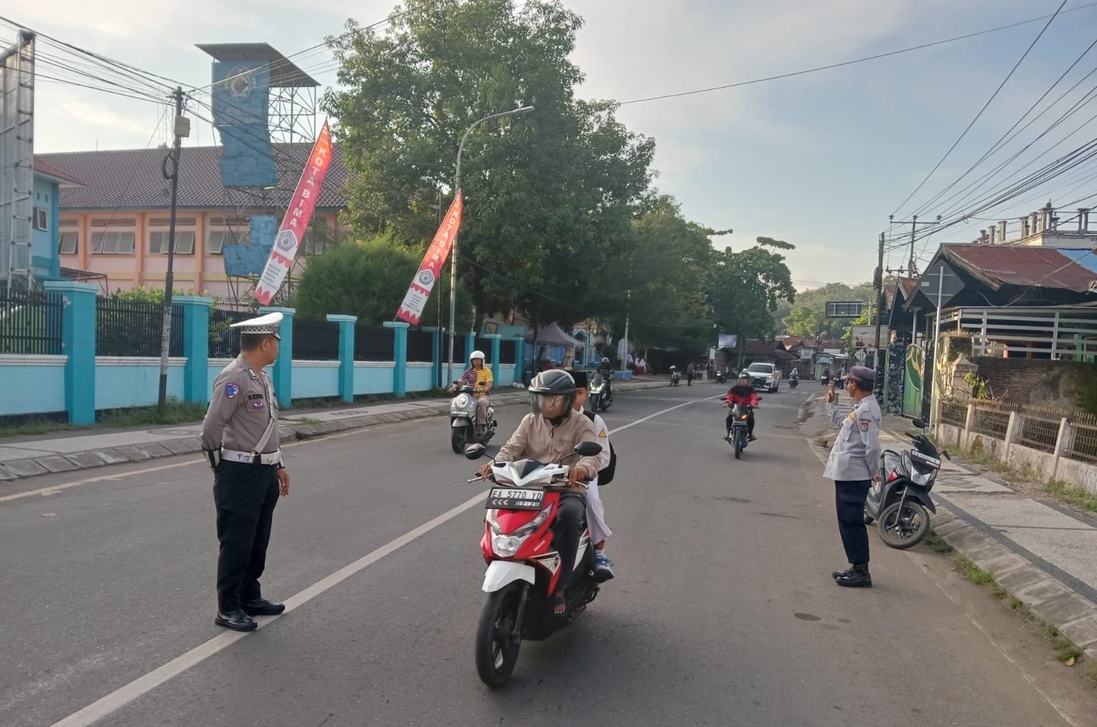 “Personel kami dikerahkan di sejumlah titik persimpangan jalan maupun kawasan padat aktivitas untuk melakukan pengaturan lalu lintas dan membantu penyebrangan pejalan kaki, termasuk para pelajar,” ujar Iptu Bambang Tedy.
