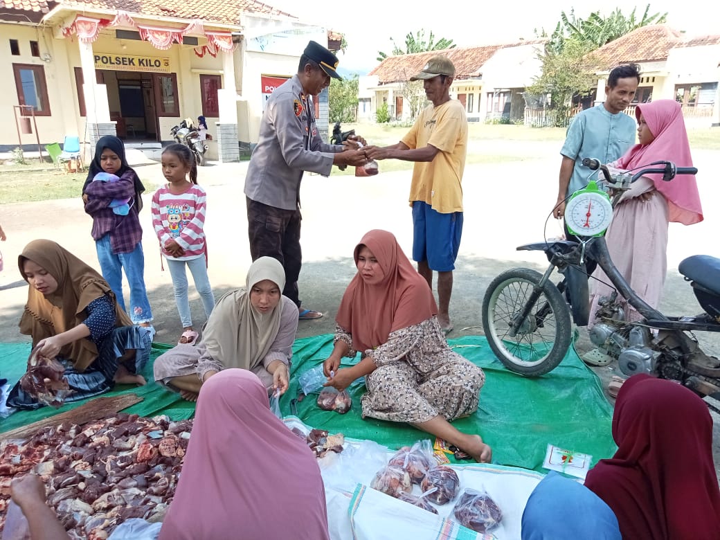 Dalam kegiatan tersebut, Polsek Kilo menyembelih 1 ekor sapi sebagai bentuk kepedulian institusi Polri terhadap masyarakat yang membutuhkan, terutama mereka yang berada di wilayah binaan hukum Polsek Kilo. Setelah proses penyembelihan dan pemotongan selesai, daging qurban langsung didistribusikan kepada 70 warga penerima manfaat di Dusun Selayar Desa Lasi, Dusun Paropa, dan Kalate Desa Malaju.
