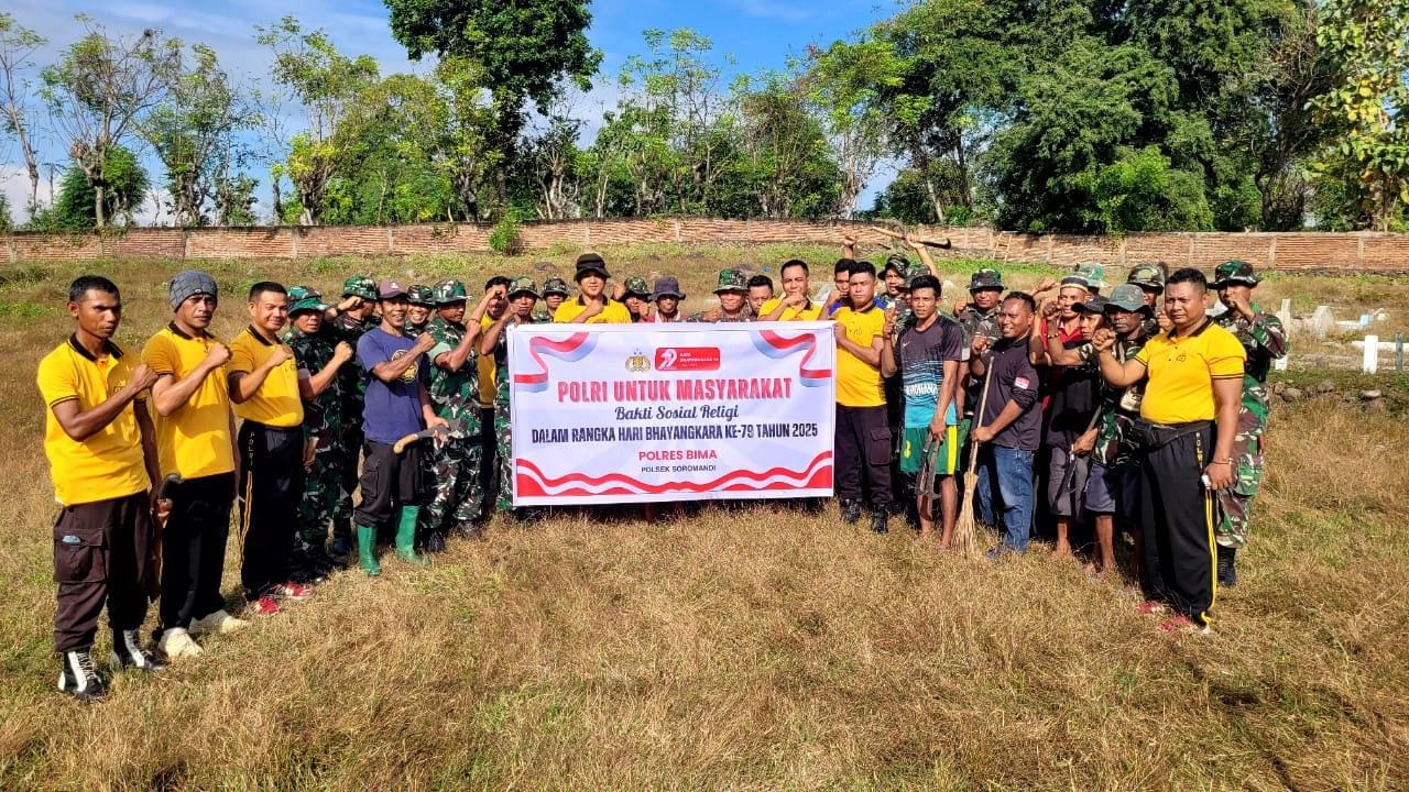 Bhakti Religi dalam rangka menyambut HUT Ke-79 Bhayangkara itu diwujudkan dengan melaksanakan bersih bersih makam di TPU Desa Bajo Kecamatan Soromandi Kabupaten.