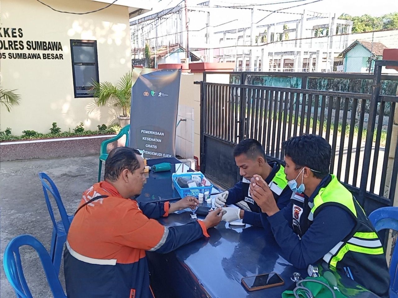 Anggota Si Dokkes Polres Sumbawa memberikan berbagai layanan kesehatan, meliputi pengecekan tekanan darah, pemeriksaan laboratorium mini (kolesterol, asam urat, dan glukosa), serta pemberian vitamin dan terapi obat bagi driver ojol yang membutuhkan.