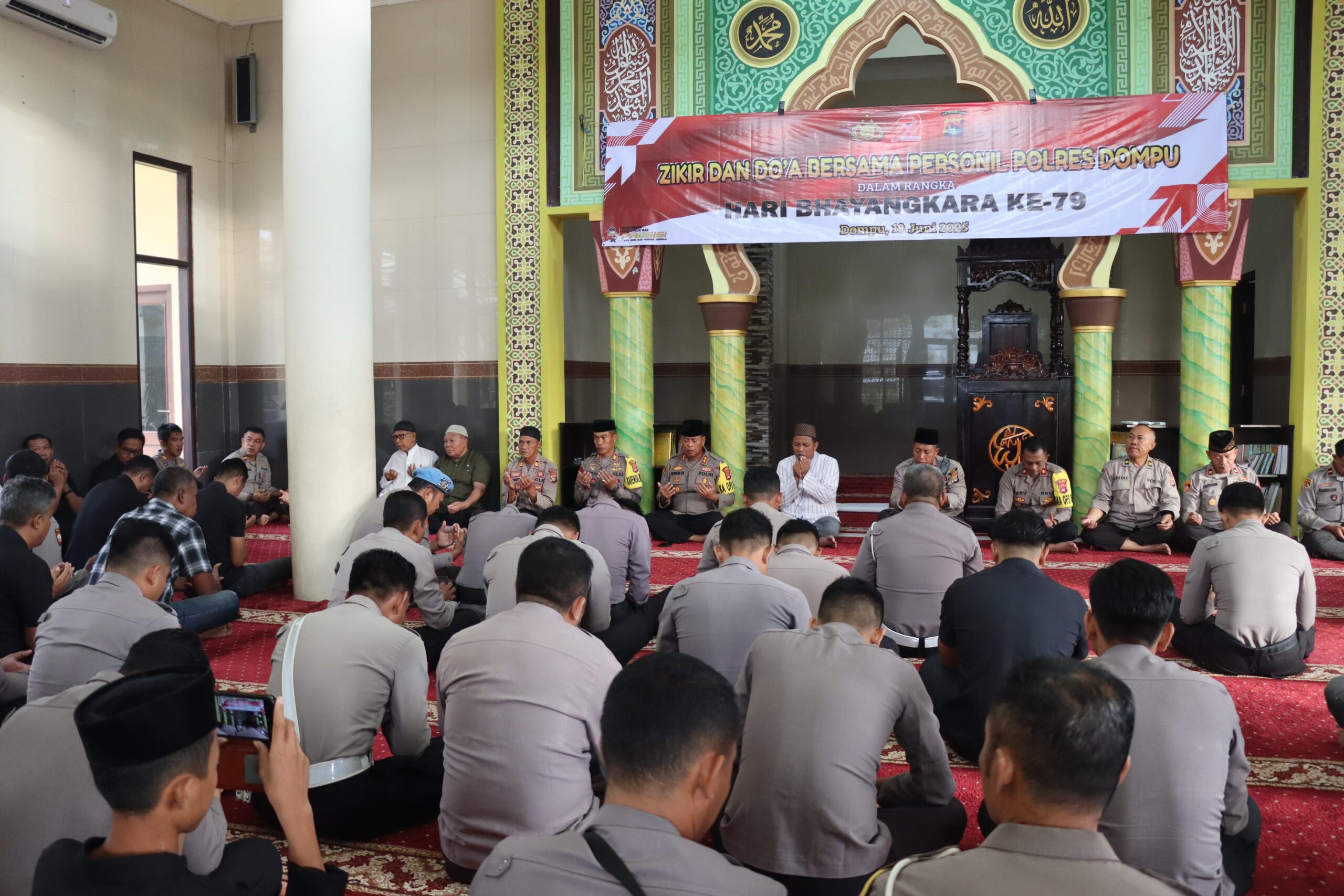 Menyambut Hari Bhayangkara ke-79 tahun 2025, Polres Dompu menggelar kegiatan dzikir dan doa bersama yang berlangsung khidmat di Masjid Miftahul Jannah Polres Dompu pada Kamis, 19 Juni 2025, pukul 07.00 WITA.