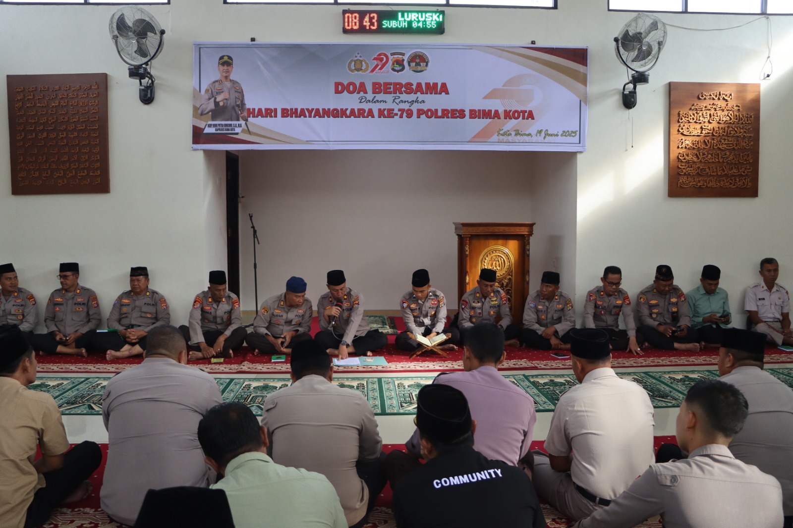 Kota Bima, NTB (19 Juni 2025) – Dalam rangka memperingati Hari Bhayangkara ke-79 tahun 2025, Polres Bima Kota menggelar kegiatan doa dan dzikir bersama yang dilaksanakan secara khidmat di Masjid Al-Jabal Qubis Mapolres Bima Kota, Kamis (19/6/2025).