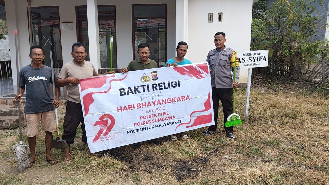 Sumbawa Besar–NTB, Dalam rangka menyambut Hari Bhayangkara ke-79, Kepolisian Sektor Rhee bersama warga masyarakat Desa Rhee, Kecamatan Rhee, menggelar kegiatan gotong royong atau bakti religi di Mushola As-Syiffa pada hari Kamis, 19 Juni 2025. Kegiatan yang dimulai sekitar pukul 13.50 WITA.