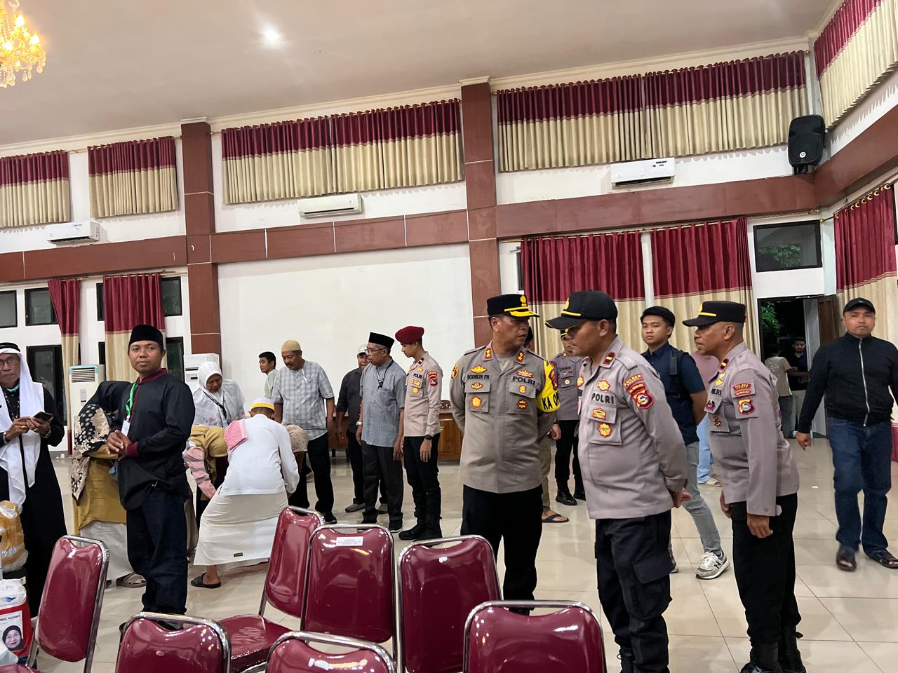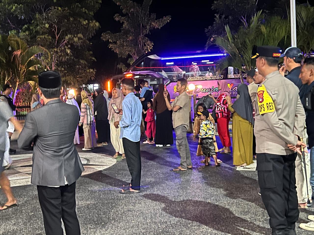 Kapolres Dompu AKBP Sodikhin Fahrojin Nur, S.I.K. bersama jajaran Forkopimda Kabupaten Dompu menyambut kedatangan Jamaah Haji Kloter 12 asal Kabupaten Dompu yang tiba di Tanah Air, Jumat malam (27/6). Kegiatan penyambutan berlangsung di Halaman Kantor Bupati Dompu sekitar pukul 20.00 WITA dengan suasana hangat dan penuh khidmat.