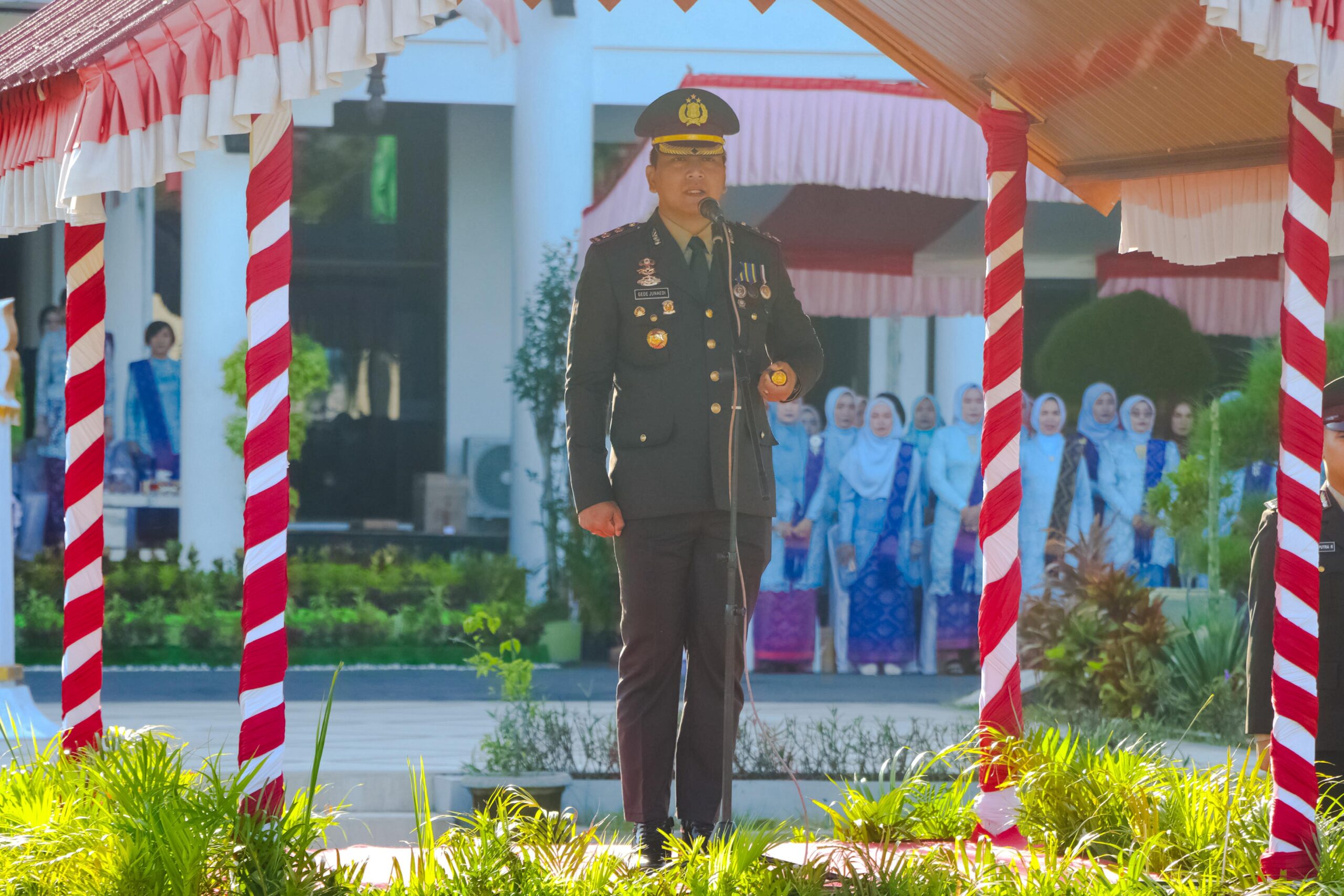 Upacara dipimpin langsung oleh Kapolres Sumbawa AKBP Bagus Nyoman Gede Junaedi, S.H.,S.I.K.,M.A.P, yang bertindak sebagai Inspektur Upacara. Kehadiran Kapolres ini memberikan kesan mendalam pada peringatan hari jadi Kepolisian Negara Republik Indonesia ini.