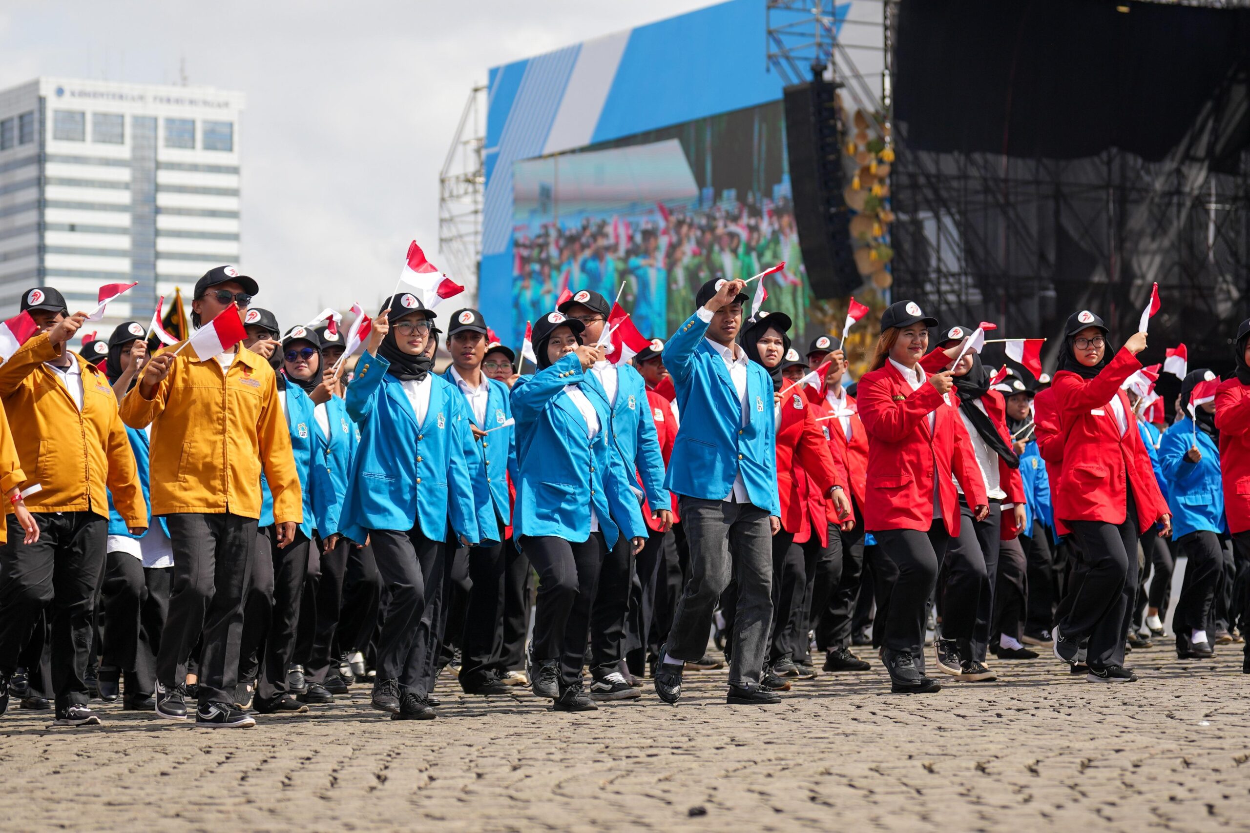 Kemudian, ada kelompok buruh yang terdiri dari beragam kelompok, termasuk buruh KSPI pimpinan Said Iqbal. Mereka mengibarkan bendera merah putih dengan kekompakannya.