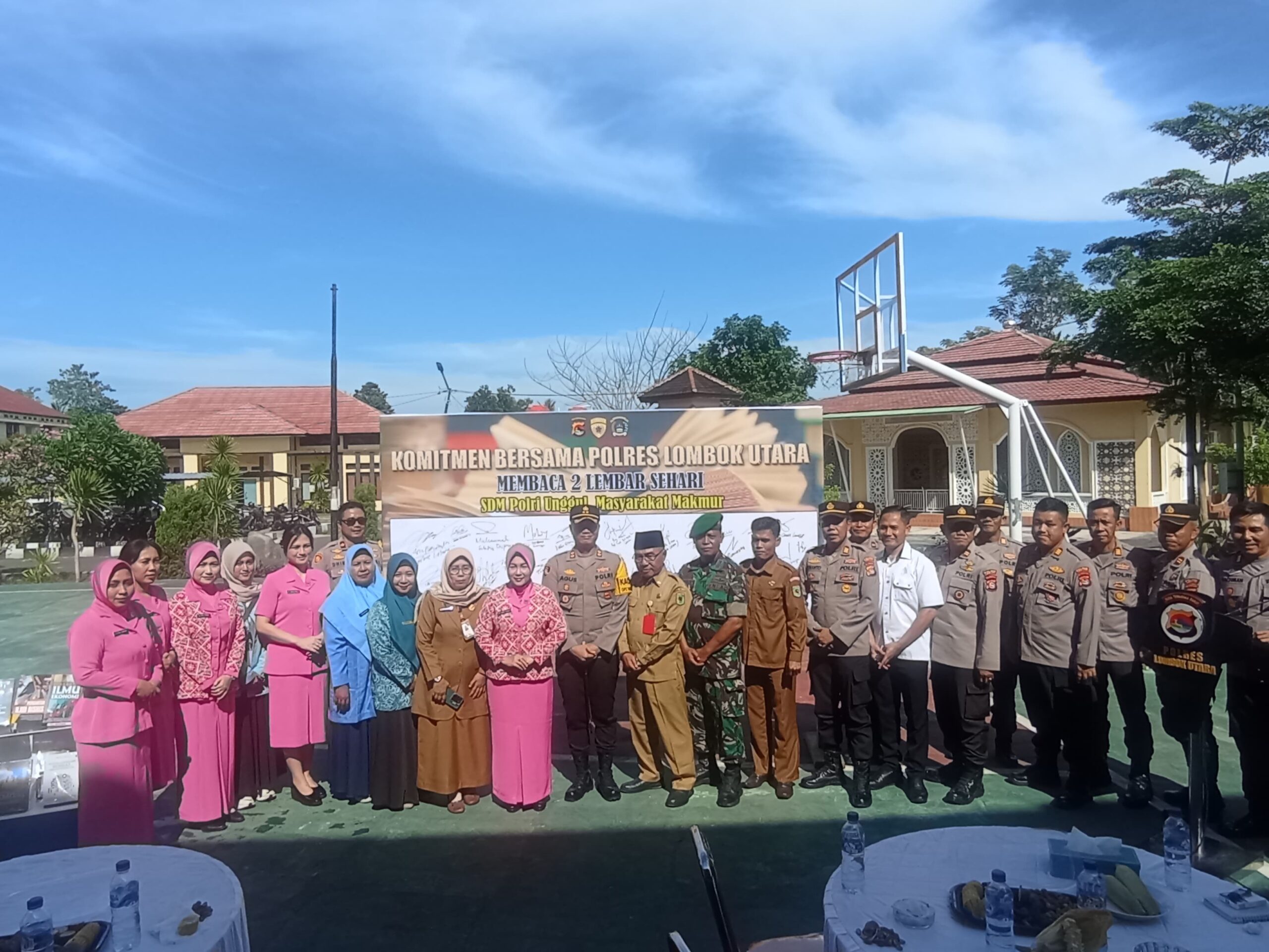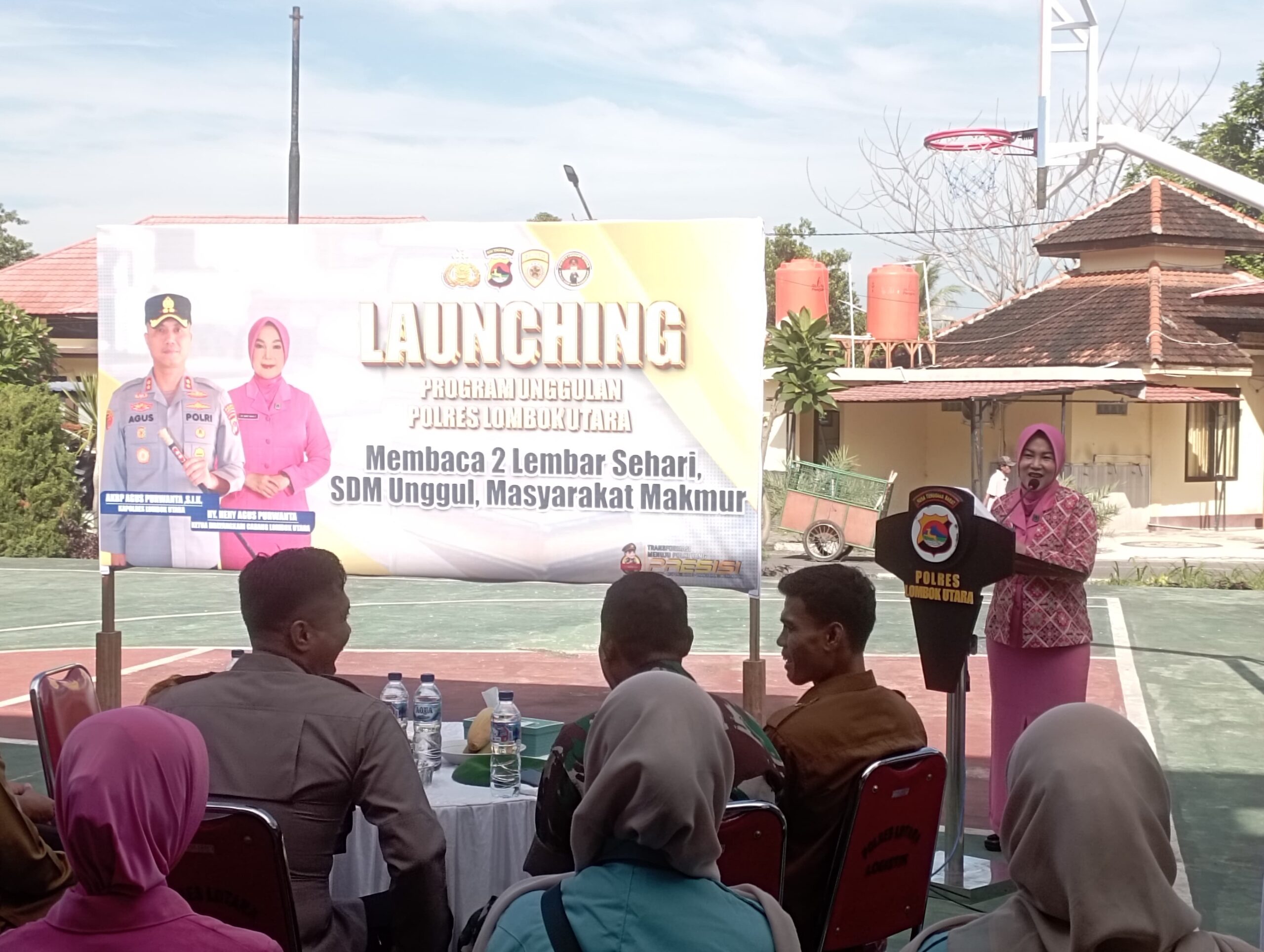 Lombok Utara, – Polres Lombok Utara resmi meluncurkan program unggulan bertajuk “Membaca 2 Lembar Sehari”, sebagai bagian dari upaya mendukung Program Mabes Polri yang bertatajuk Polri belajar guna peningkatan kualitas sumber daya manusia (SDM) dan menciptakan masyarakat yang makmur dan berwawasan. Program ini merupakan hasil inisiasi dari Ketua Bhayangkari Cabang Lombok Utara, Ny. Heny Agus Purwanta, bersama Kabag SDM AKP Agus Rachman SH. M.I.Kom, sejalan dengan program Polri Belajar dalam pengembangan literasi.