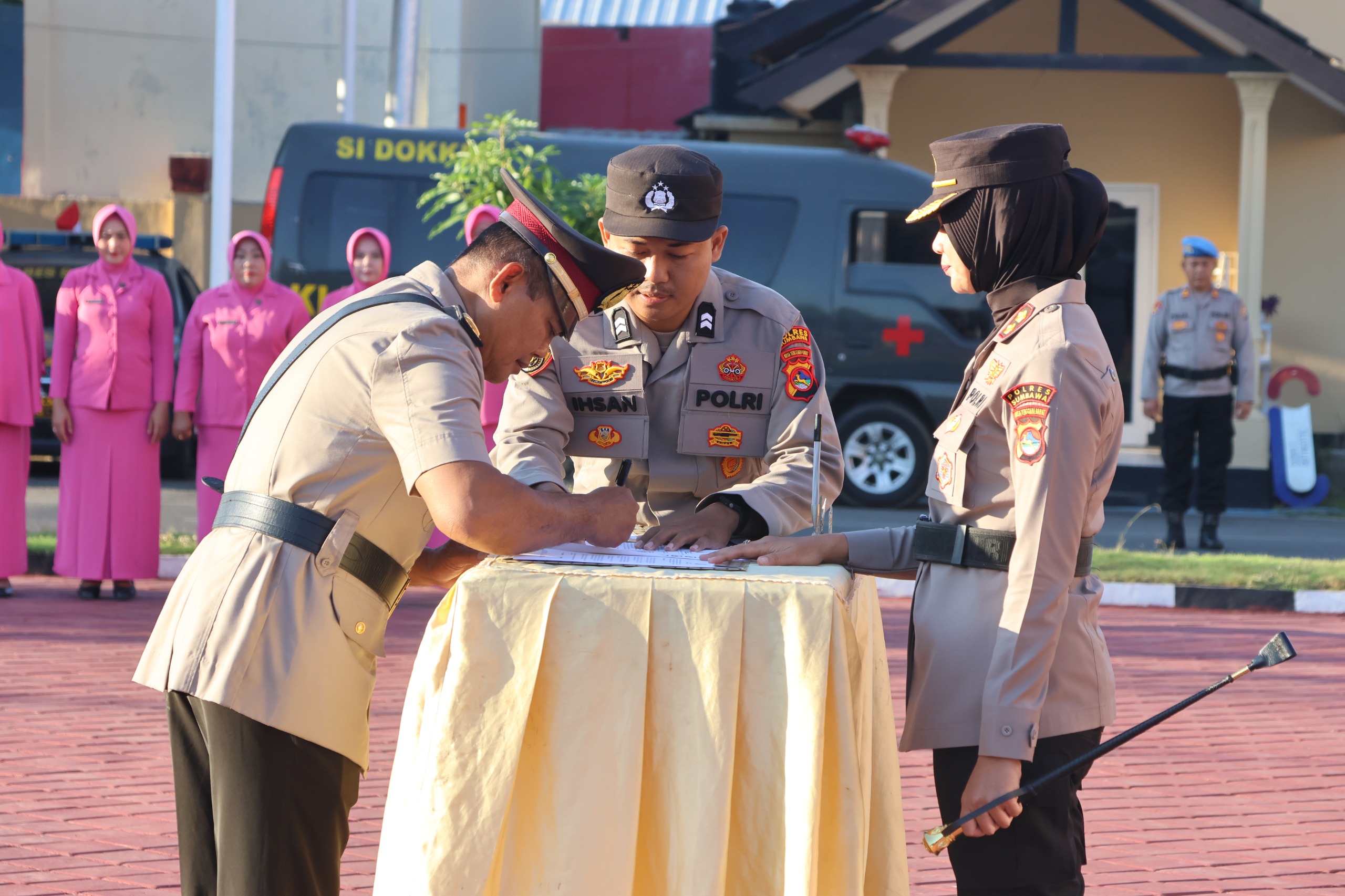 Prosesi upacara dimulai dengan laporan Perwira Upacara, AKP Sumardi, S.SOS., kepada Kapolres sebagai Inspektur Upacara. Salah satu momen krusial dalam upacara ini adalah pembacaan Surat Keputusan Kepala Kepolisian Daerah Nusa Tenggara Barat yang mengatur tentang penempatan dan pengangkatan dalam jabatan di lingkungan Polda NTB. Setelah itu, dilanjutkan dengan pengambilan sumpah jabatan dan penandatanganan berita acara.