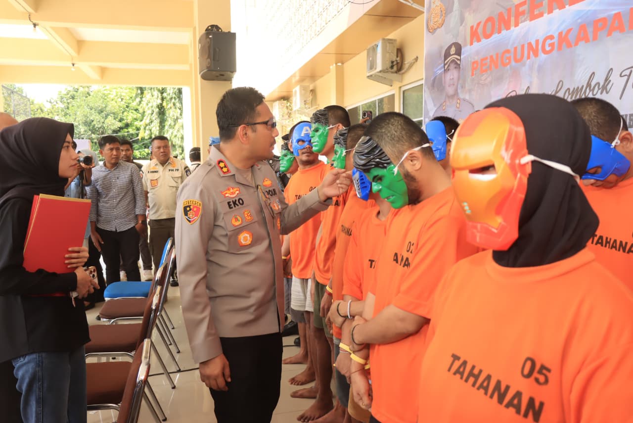 Pesan di Balik Topeng ‘Super Hero’ Para Tersangka Saat Konferensi di Polres Loteng.