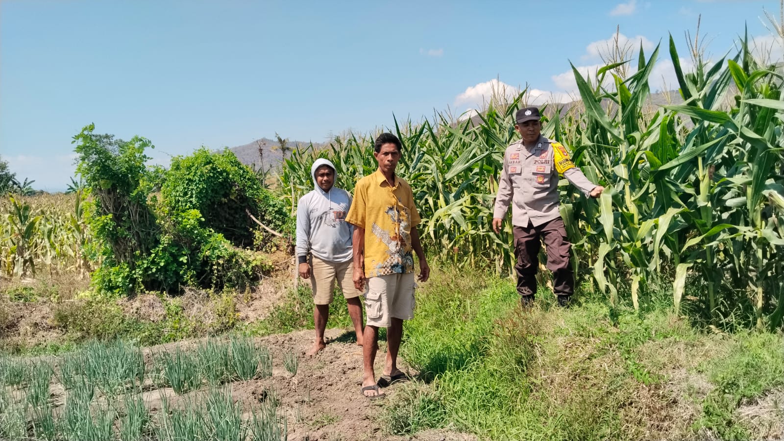 Bhabinkamtibmas (BKTM) Desa Mumbu, Brigadir Akbar, melaksanakan kegiatan pemantauan terhadap perkembangan tanaman jagung milik warga binaan di Dusun Madamina, Desa Mumbu, Kecamatan Woja, Kabupaten Dompu.