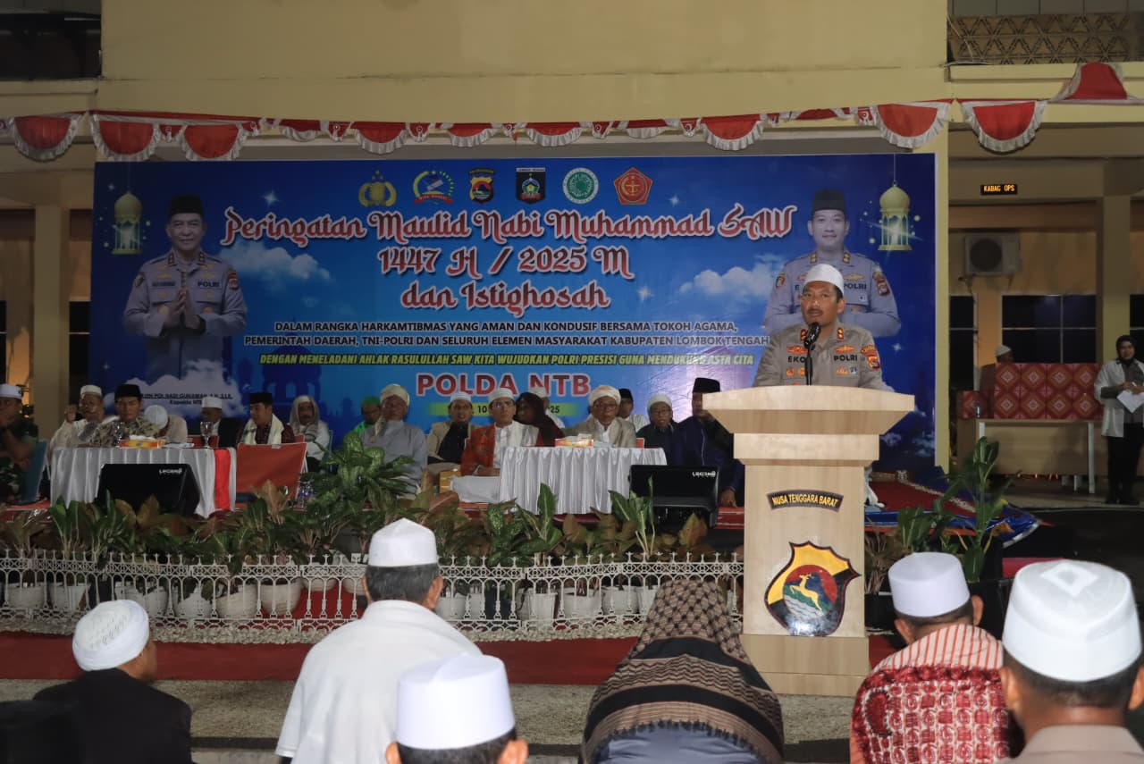 Lombok Tengah, (NTB) – Kepolisian Resor (Polres) Lombok Tengah menggelar acara peringatan Maulid Nabi Muhammad SAW 1447 H / 2025 M yang dirangkaikan dengan Istighosah di Lapangan Apel Mapolres Lombok Tengah, Rabu (10/9).
