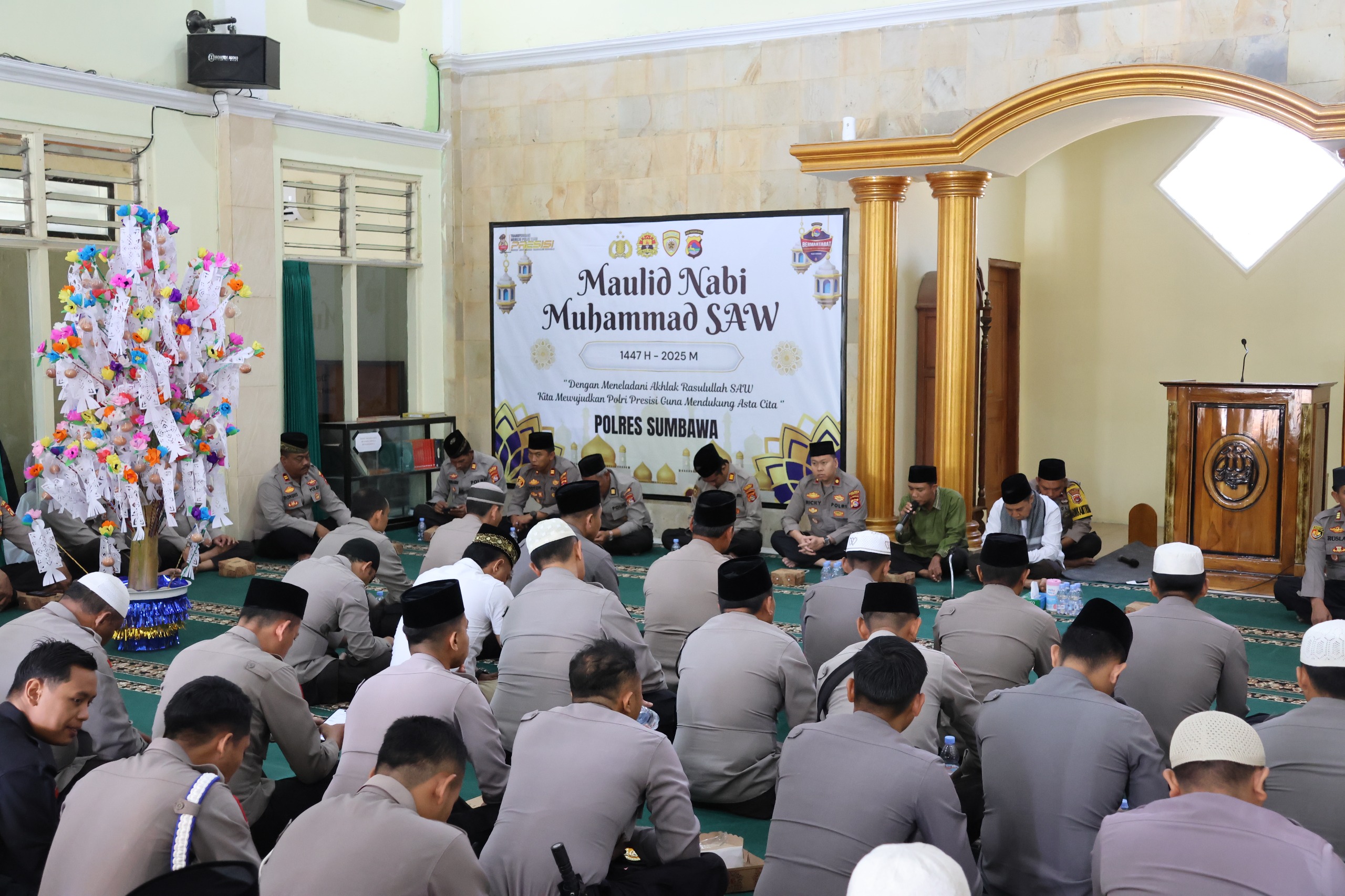 Sumbawa, NTB – Seluruh personel muslim Kepolisian Resor (Polres) Sumbawa memperingati Maulid Nabi Muhammad SAW 1447 Hijriah dengan penuh khidmat. Acara yang diselenggarakan pada Jumat, 12 September 2025, ini mengambil tempat di Masjid Bhayangkara Al Waliyy’ Polres Sumbawa.