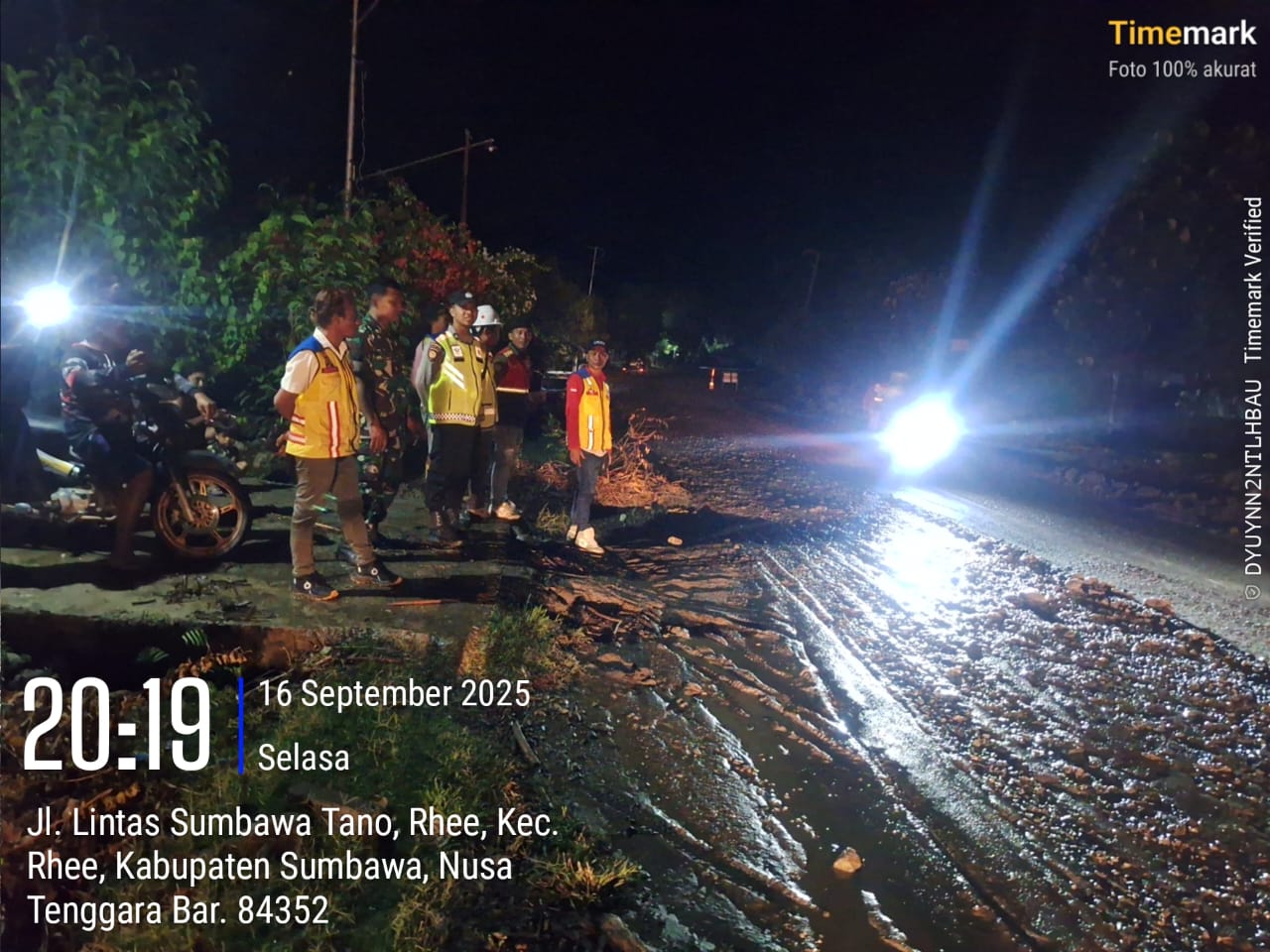 Sekitar pukul 20.00 WITA, petugas dari Dinas Pekerjaan Umum (PU) sedang melakukan pembersihan jalan di Kampung Jati Sari, Desa Rhee. Hujan deras yang terjadi sebelumnya meninggalkan lumpur dan bebatuan di sepanjang jalan, membuatnya licin dan berbahaya bagi pengendara.