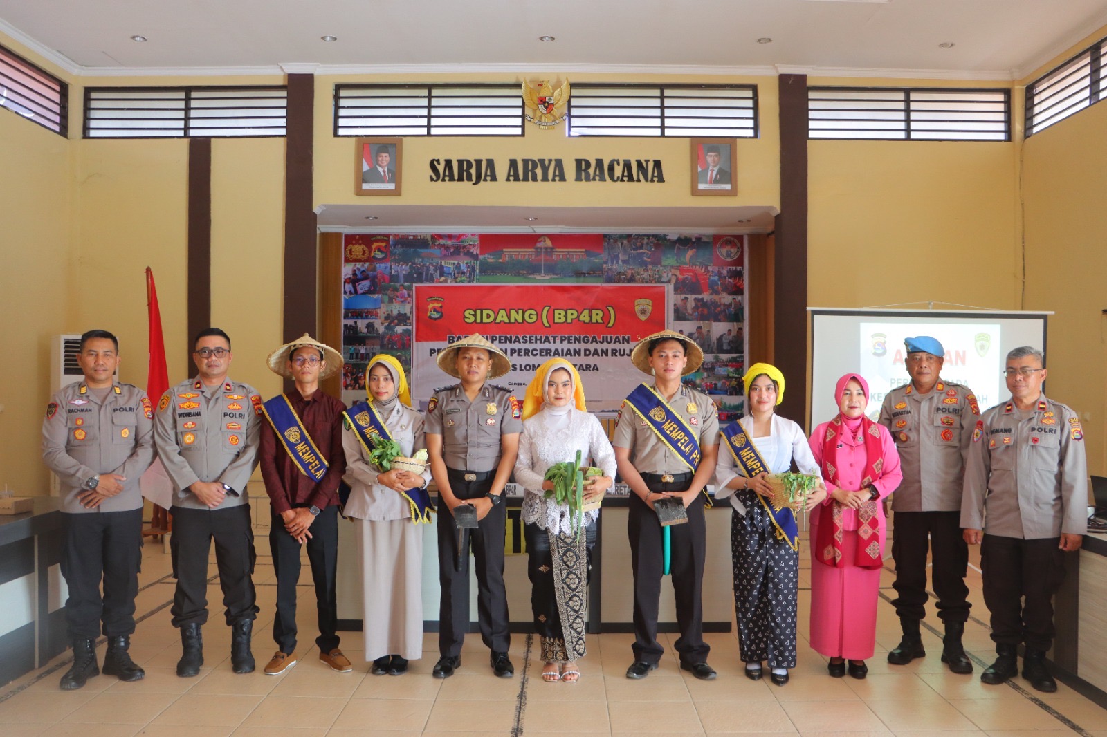 Tercatat tiga pasangan mengikuti sidang perkawinan kedinasan, yakni BRIPTU Yayan Hardiman dengan calon Siska Widianingsih, BRIPDA Diwangga Bagus Vinanna Putra dengan calon Nayanti, serta PNS Polri Elva Pratiwi dengan calon Angga Sabda Husna. Menariknya, peserta sidang tampil dengan busana bernuansa pertanian, mengenakan *kecaping* dan membawa hasil bumi berupa sayuran sebagai simbol dukungan terhadap ketahanan pangan.
