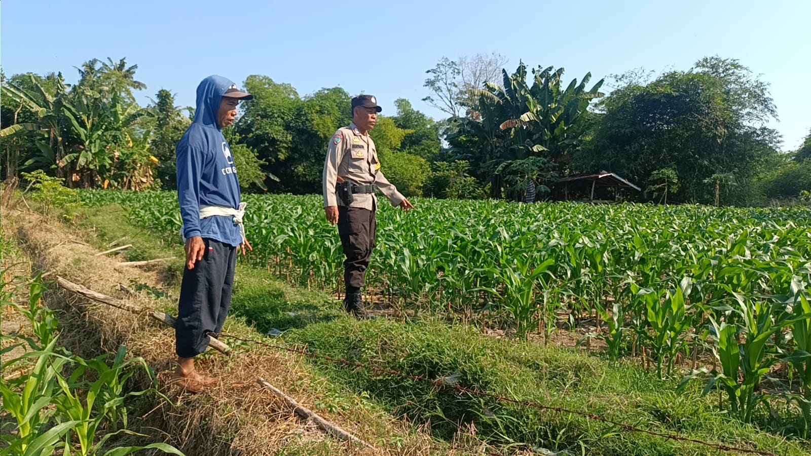 Kegiatan monitoring terbaru dilaksanakan pada Rabu, 8 Oktober 2025, pukul 10.35 WITA. Bhabinkamtibmas, melaksanakan sambang sekaligus pengecekan langsung di sawah Kecamatan Buer. Pemilik lahan, Bapak I, tengah menanam jagung tahap kedua yang kini baru berumur 35 hari.