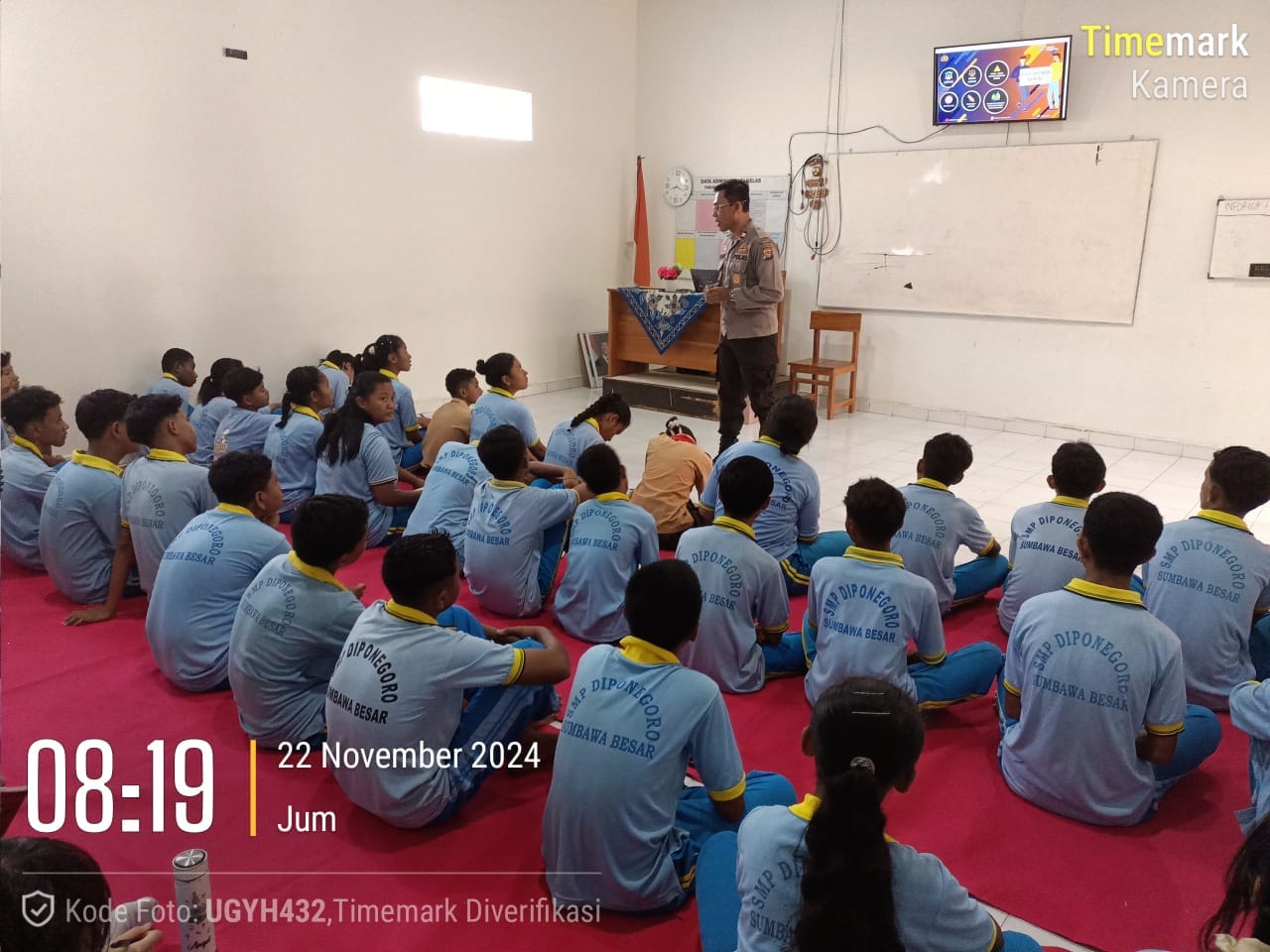 Sumbawa Besar-NTB, Sat Binmas Polres Sumbawa melaksanakan kegiatan sosialisasi dan penyuluhan terkait Generasi Sehat Anti Narkoba, Tanpa Perundungan, Kekerasan & Intoleransi (Bullying), serta Kenakalan Remaja” di Aula SMP Diponegoro, Kabupaten Sumbawa, Jumat (22/11/24) pagi.