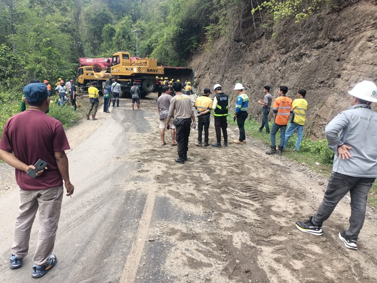 Sementara satu unit crane dikerahkan dari PT. AMNT untuk membantu evakuasi Truk Fuso tersebut sampai pukul 12.00 WITA Truk Fuso yang terguling bisa dievakuasi sehingga arus lalu lintas bisa kembali normal.