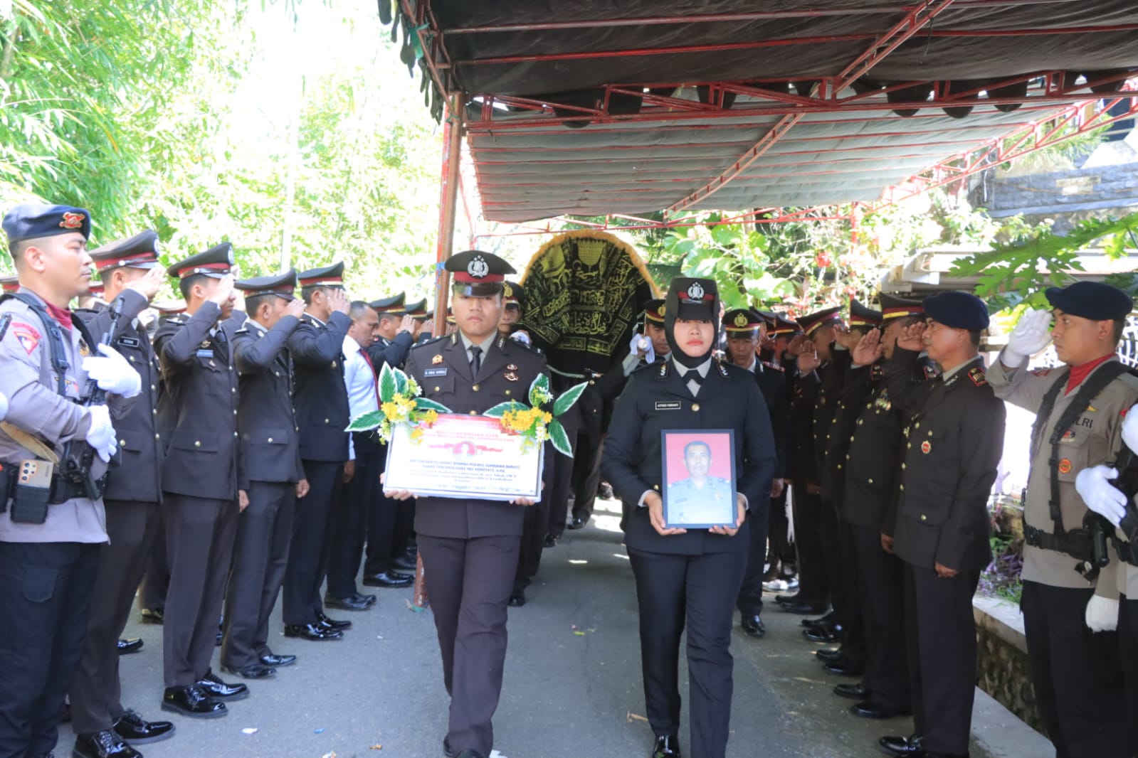 Prosesi pemakaman berlangsung secara kedinasan, sebagai bentuk penghargaan atas jasa dan pengabdian almarhum selama bertugas di institusi kepolisian.
