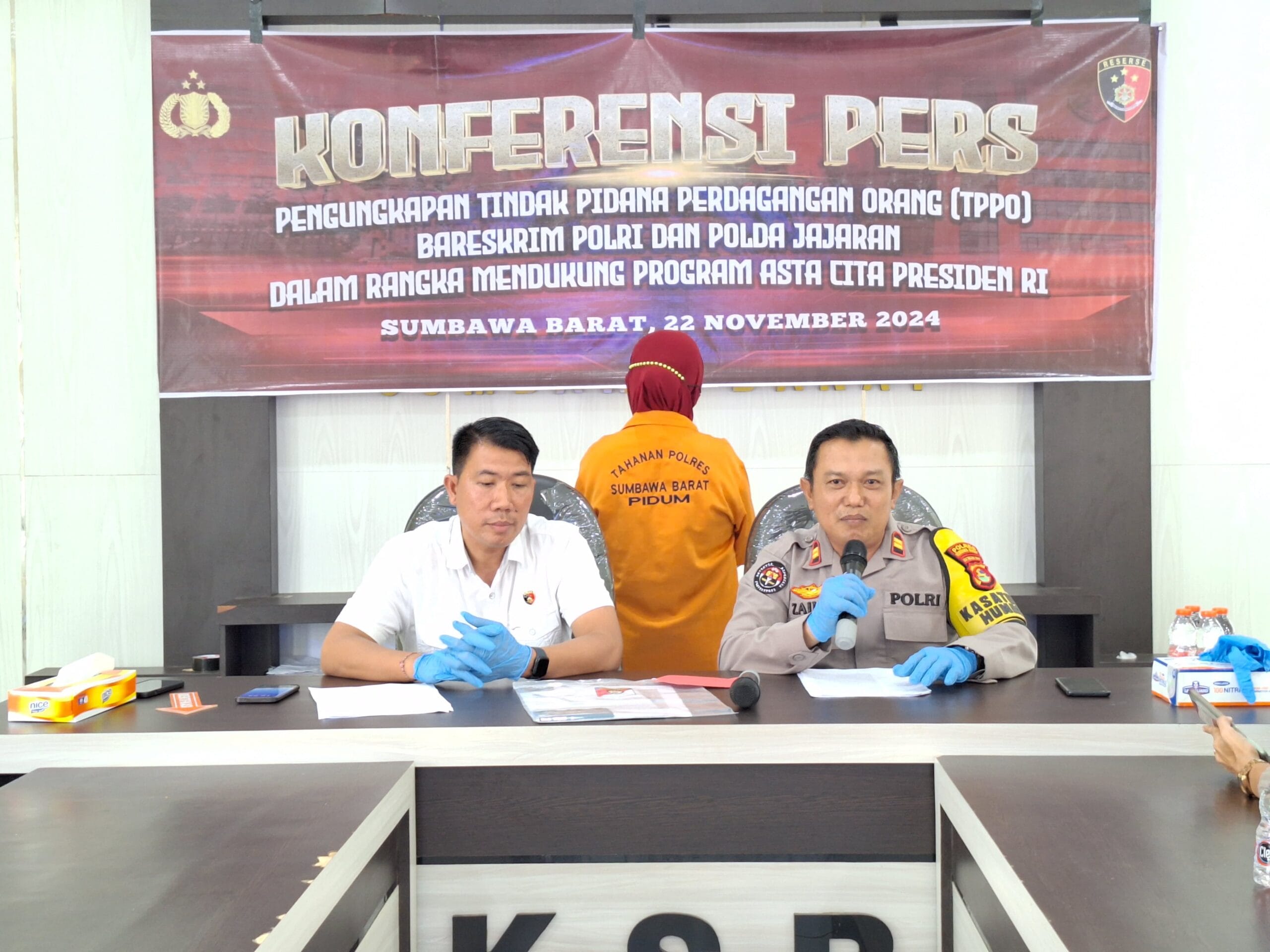 Kapolres Sumbawa Barat, AKBP Yasmara Harahap, S.I.K., melalui Kasat Reskrim, Iptu I Kadek Suadaya Atmaja, dalam konferensi pers yang didampingi Kasi Humas, Iptu Zainal Abidin, S.H., menerangkan kepada awak media bahwa konferensi pers tentang pengungkapan kasus Tindak Pidana Perdagangan Orang (TPPO) dilaksanakan secara serentak di jajaran Polri seluruh Indonesia, Jumat (22/11/2024).
