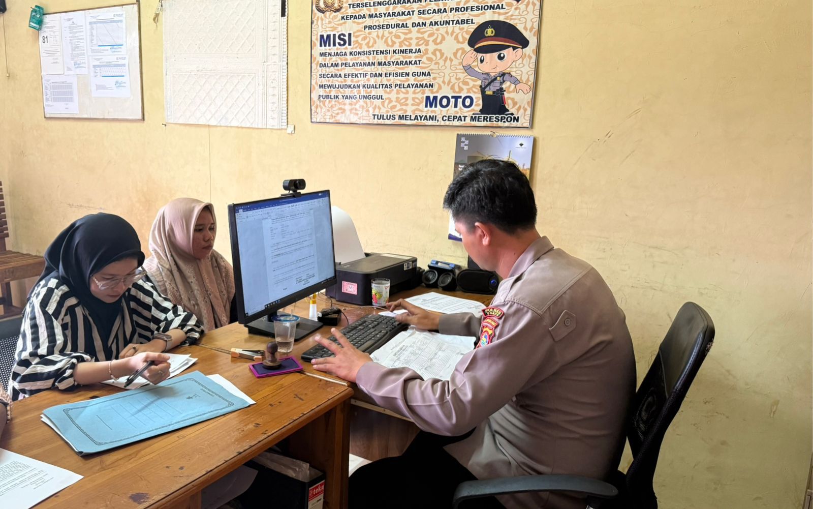 Dalam kegiatan tersebut, petugas SPKT terlihat melayani masyarakat dengan profesional dan humanis. Petugas menerima laporan, melakukan pencatatan administrasi, serta memastikan setiap data yang disampaikan warga terinput dengan benar dalam sistem pelayanan. Proses pelayanan berlangsung di ruang SPKT Polres Dompu dengan suasana yang tertib, sebagaimana terlihat pada foto terlampir—di mana petugas memberikan penjelasan dan membantu pelapor memahami proses pembuatan laporan.