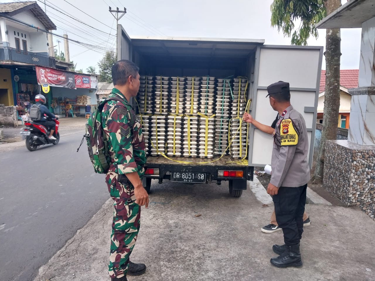 Bhabinkamtibmas Desa Aik Bukaq, AIPDA Arsyad, bersama Babinsa Serma Abdullah melaksanakan pendampingan dan pengawasan langsung pendistribusian makanan bergizi gratis yang dilaksanakan oleh SPPG Aik Bukaq Batukliang Utara #003 Yayasan Sukma Nusa Saajada, Rabu (21/01/2026) pagi.