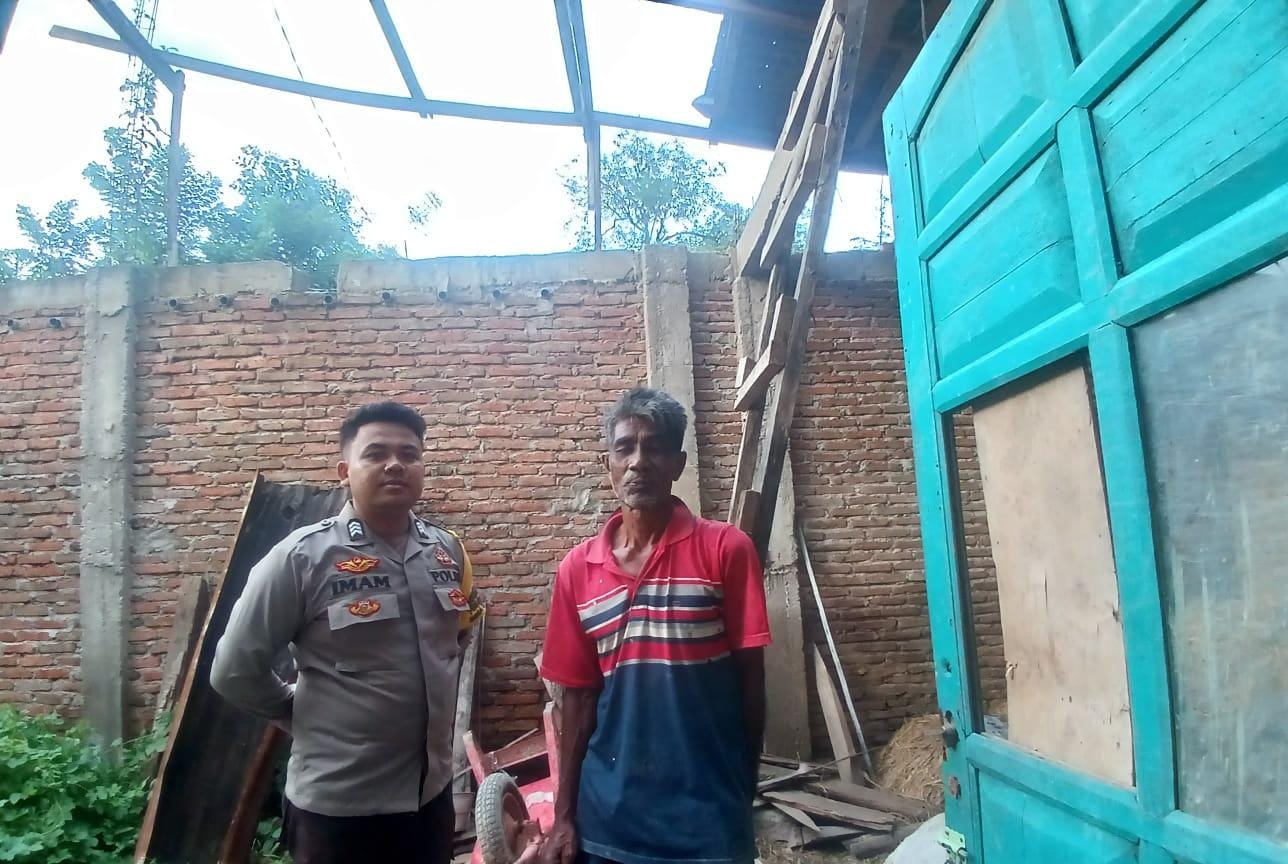 Bhabinkamtibmas Polsek Woha Polres Bima Polda Brigadir Imam Banurusman sigap membantu warga binaannya yang terdampak musibah angin puting beliung.