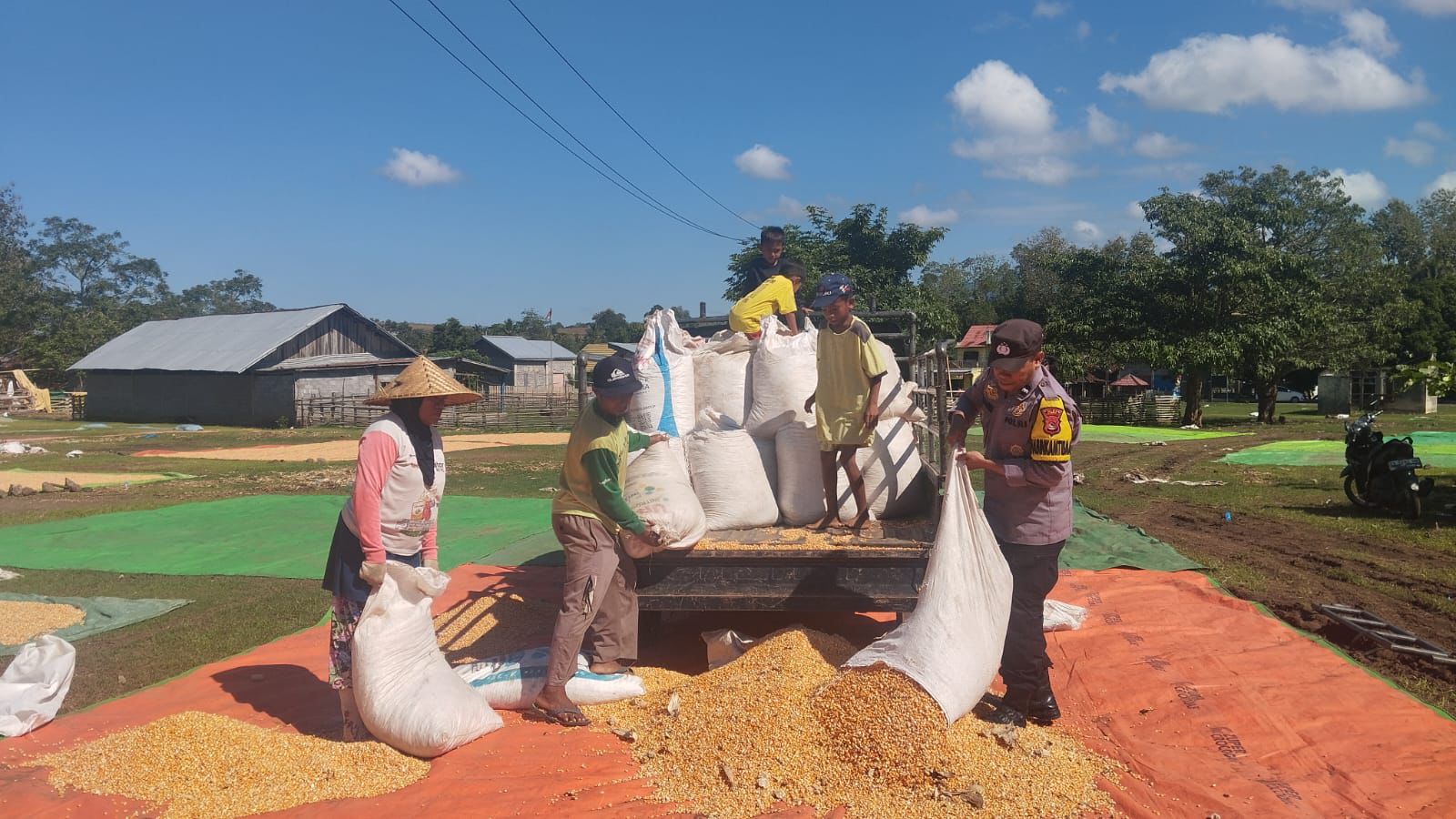 Dalam kegiatan tersebut, AIPDA Ibrahim turut membantu langsung proses penjemuran jagung bersama petani sebagai bentuk kepedulian dan kedekatan Polri dengan masyarakat.