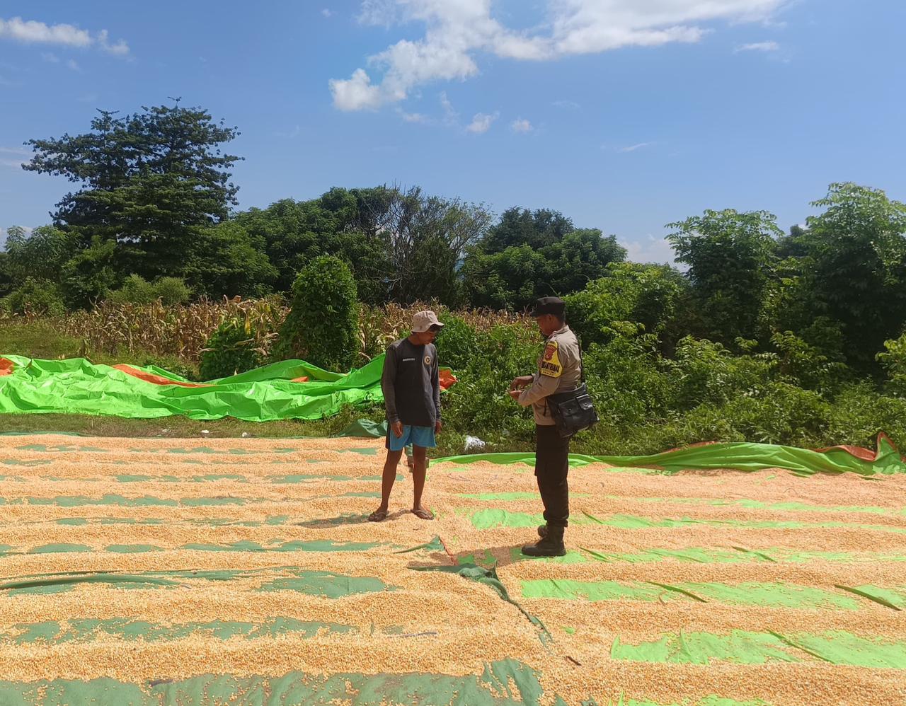 Dalam rangka mendukung program ketahanan pangan nasional, Polsek Pekat melalui Bhabinkamtibmas Desa Sorinomo melaksanakan kegiatan pemantauan terhadap hasil panen jagung milik warga binaan yang sedang dalam proses penjemuran.