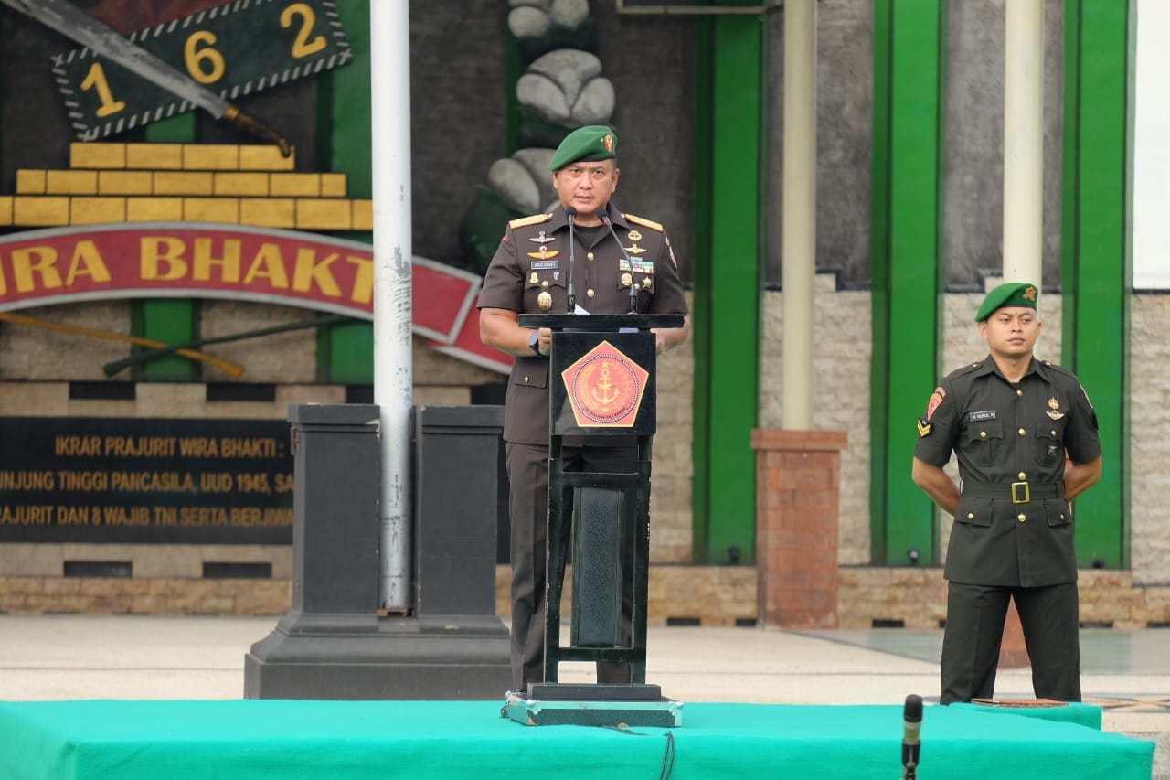 Sebagai Inspektur Upacara, Danrem 162/WB Brigjen TNI Agus Bhakti membacakan amanat Presiden Republik Indonesia, Bapak Prabowo Subianto, yang juga menjabat sebagai Penasehat Nasional KORPRI.