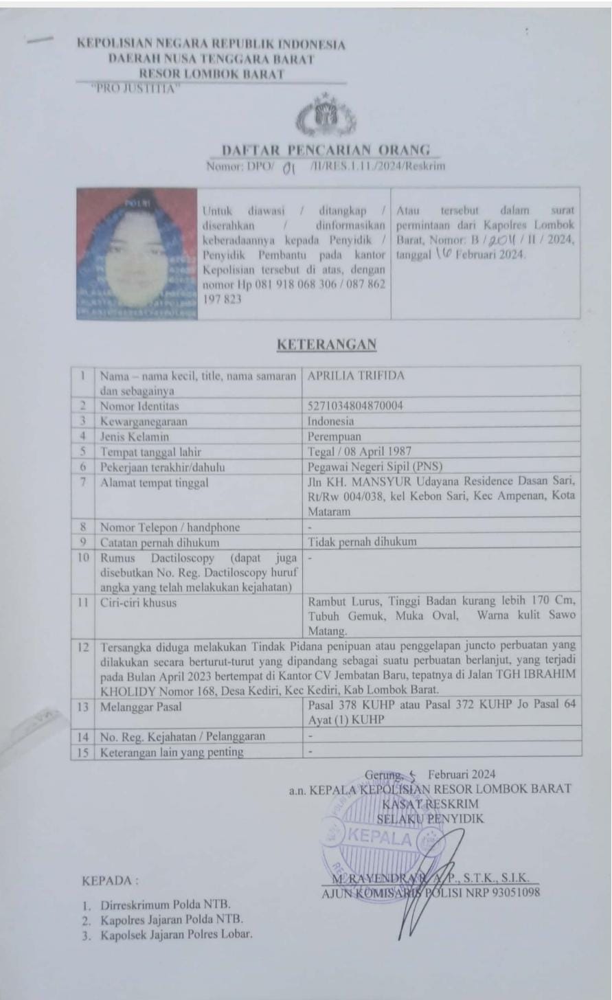 Sebelumnya, Satreskrim Polres Lombok barat telah menerbitkan DPO terhadap tersangka Aprilia trifida pada 5 Februari 2024 lalu, usai mangkir dari panggilan penyidik untuk melaksanakan pemeriksaan. Penerbitan itu dilakukan karena yang bersangkutan tidak kooperatif.