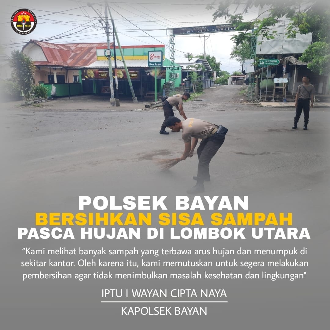 Lombok Utara, – Polsek Bayan, di bawah melaksanakan kegiatan pembersihan sisa sampah pasca hujan yang melanda wilayah Lombok Utara. Kegiatan ini dilakukan di depan kantor Polsek Bayan pada hari Senin, 16 Desember 2024.