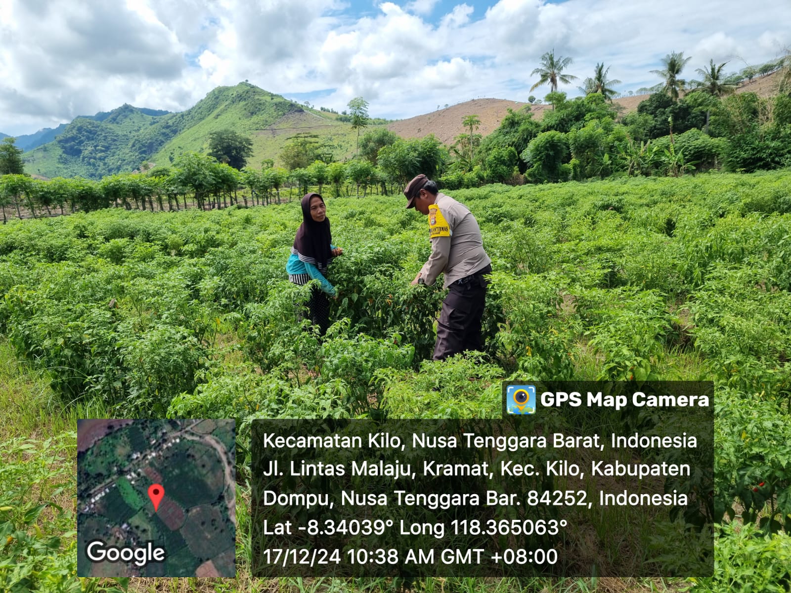 Bhabinkamtibmas Polsek Kilo, Aipda M. Nursalam, melaksanakan kegiatan pemantauan tanaman cabe milik Ibu Fatimah di Dusun Enca, Desa Kramat, Kecamatan Kilo, Kabupaten Dompu. Kegiatan ini dilakukan dalam rangka mendukung Program Ketahanan Pangan Nasional menuju Indonesia Emas 2024, Selasa (17/12/2024).
