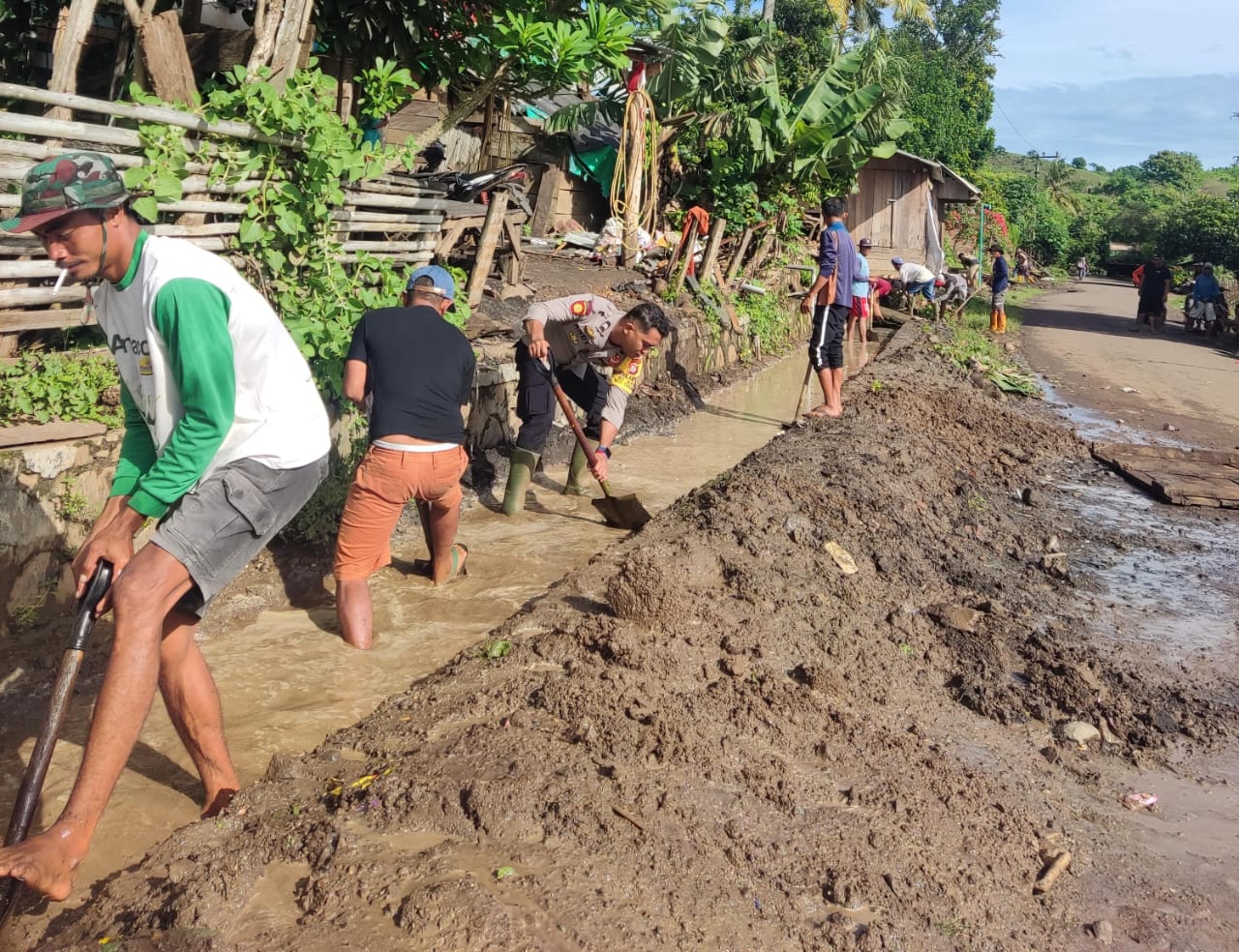 Sumbawa Besar-NTB, Bhabinkamtibmas Desa Mata, BRIPTU Muh. Andy Ramadhan, bersama dengan Babinsa Mata, Koptu Asikin, Kepala Desa Mata Sukirman, perangkat desa, dan masyarakat setempat melaksanakan kegiatan gotong royong pembersihan saluran/parit di Desa Mata, Kecamatan Tarano, Jumat ( 20/12/24) pukul 07.00 WITA.