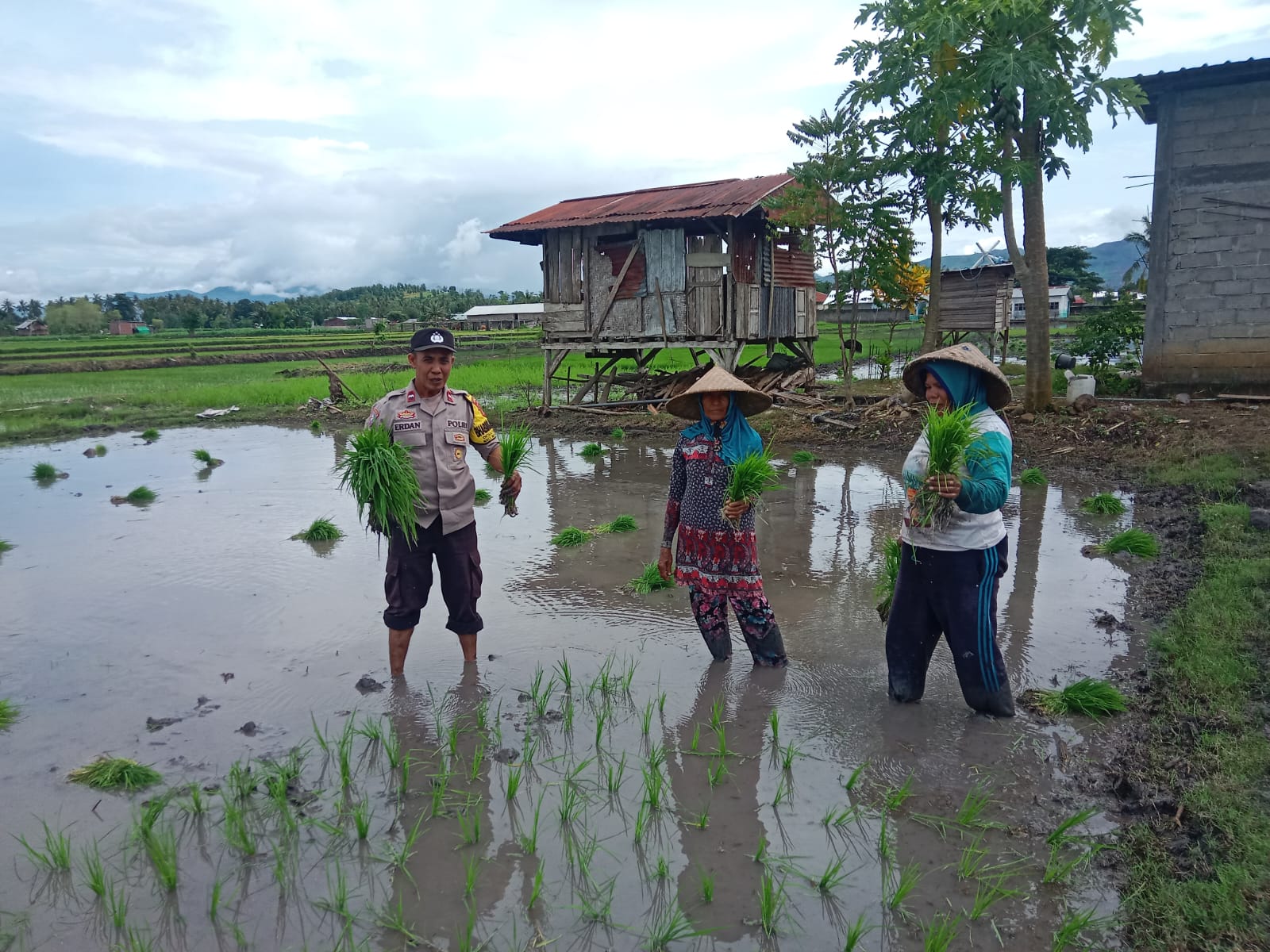 Acara dimulai pukul 08.40 WITA, diawali dengan pemantauan kondisi lahan pertanian jenis padi milik Bapak Dahlan yang tengah dalam proses penanaman. AIPDA Erdan juga turut membantu menanam padi sembari memberikan sosialisasi tentang pentingnya optimalisasi lahan untuk mendukung ketahanan pangan.