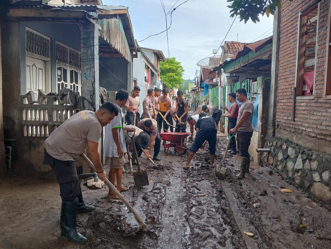 Kota Bima, NTB (29/12) – Sebagai wujud kepedulian terhadap masyarakat yang terdampak banjir, personel Polres Bima Kota menggelar aksi gotong royong untuk membersihkan sisa-sisa lumpur dan material yang menggenangi jalan serta rumah warga di Kelurahan Paruga, Kota Bima.