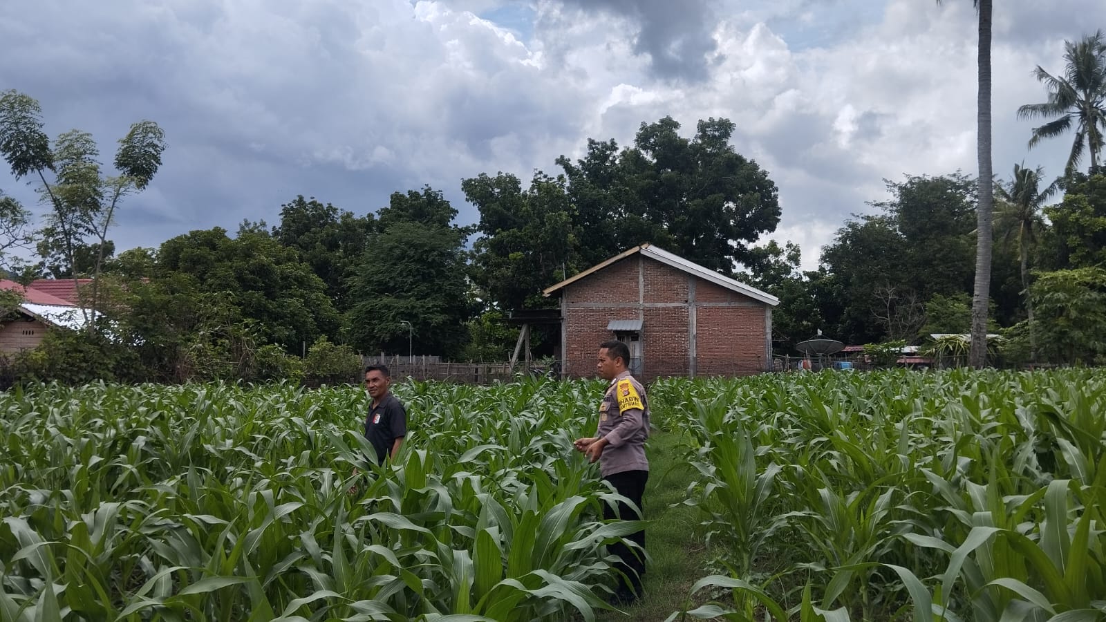 Bripka Ibrahim membantu Bapak Hamdan dalam mengelola lahannya yang ditanami jagung dan beberapa tanaman pangan lainnya. Selain memberikan pendampingan teknis, ia juga menyampaikan motivasi kepada warga untuk terus berinovasi dalam memanfaatkan lahan pekarangan yang dimiliki.