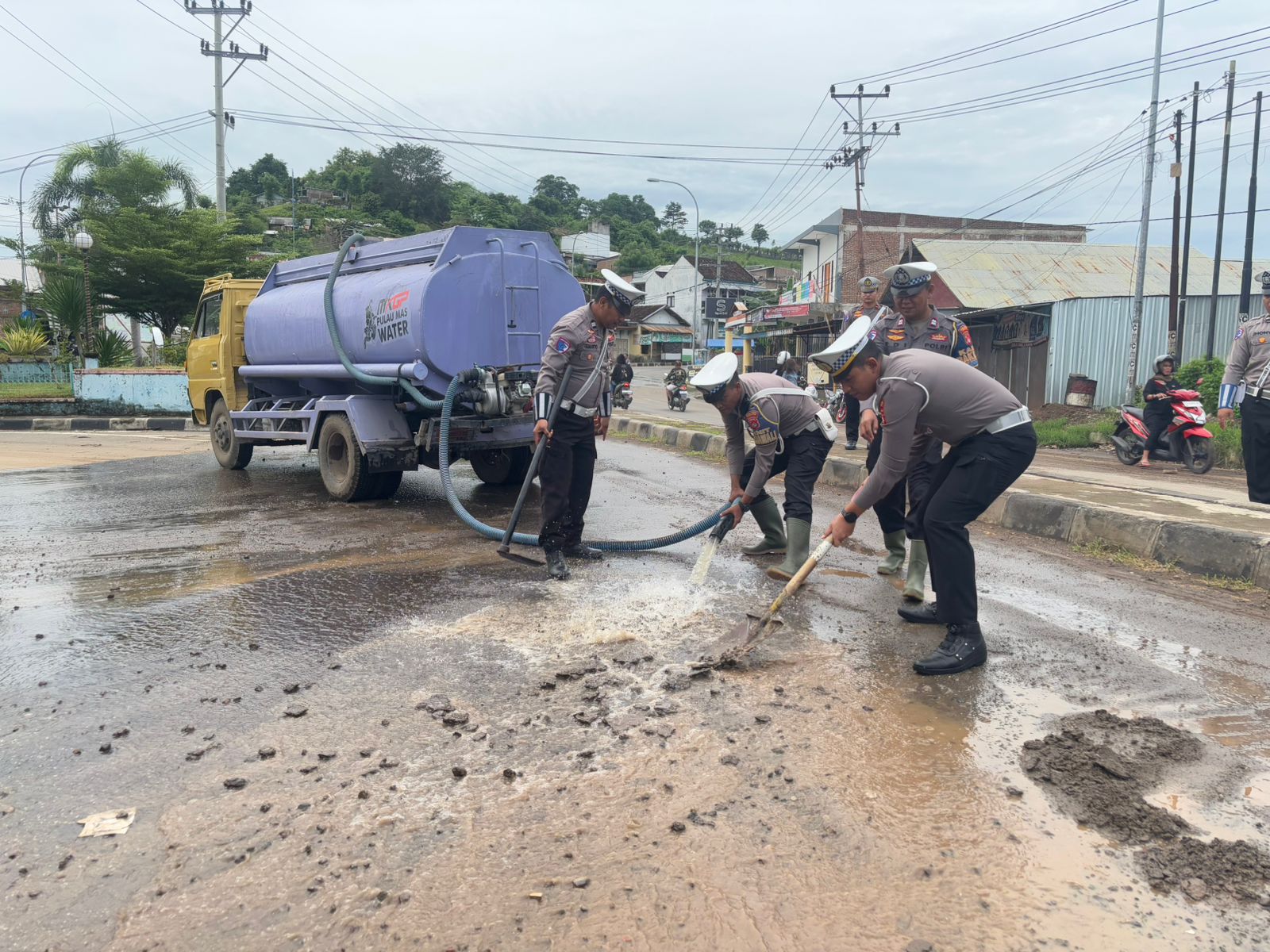 Dalam kegiatan tersebut, Sat Lantas Polres Sumbawa mengerahkan satu unit mobil tanki air untuk menyiram dan membersihkan jalan dari material tanah dan lumpur hingga bersih. Tujuan dari kegiatan ini adalah untuk memastikan bahwa jalan dapat dilalui dengan aman oleh pengendara, serta untuk melancarkan arus lalu lintas.