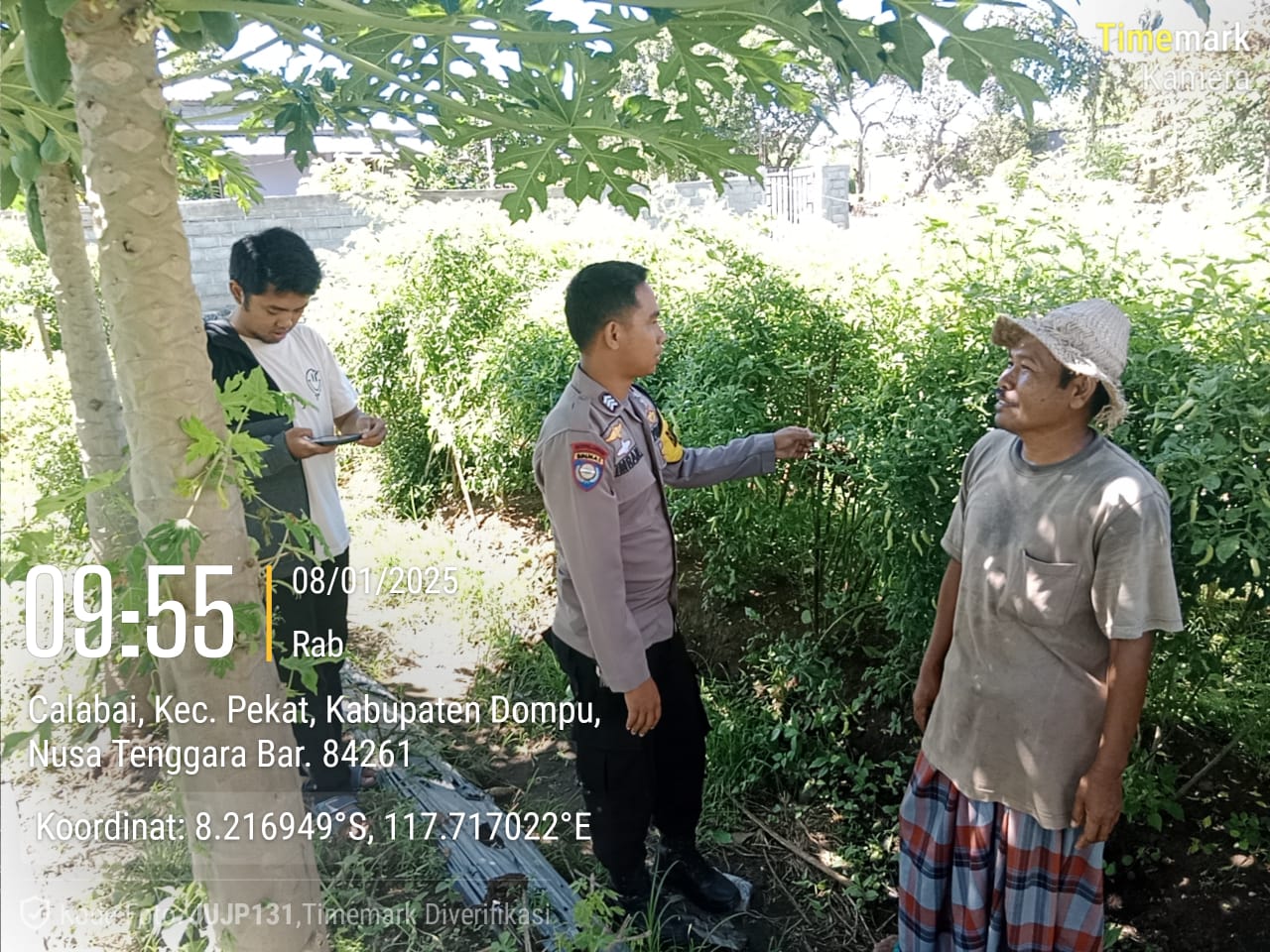 Dalam upaya mendukung pelaksanaan Program Ketahanan Pangan Nasional Menuju Indonesia Emas 2024, Bhabinkamtibmas Desa Calabai, Polsek Pekat, BRIGPOL Imran, melaksanakan pemantauan lahan milik Sdr. Usman di Dusun Jonggat, Desa Calabai, Kecamatan Pekat, Kabupaten Dompu, pada Rabu (08/01/2025).