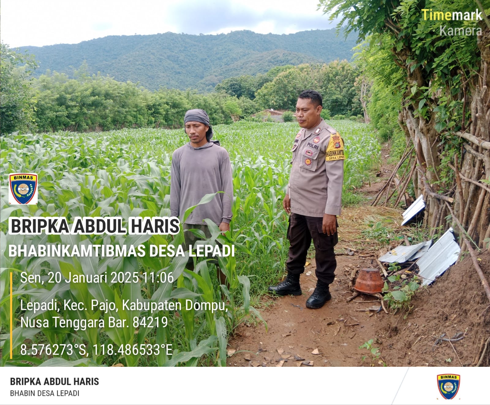 Dalam rangka mendukung pelaksanaan Program Ketahanan Pangan Nasional menuju Indonesia Emas 2025, Bhabinkamtibmas (BKTM) Desa Lepadi, BRIPKA Abdul Haris, melaksanakan kegiatan sambang dan pemantauan lahan pertanian milik salah satu warga binaannya, Sdr. Ahmad. Kegiatan ini berlangsung di lahan kebun jagung di Desa Lepadi, Kecamatan Pajo, Kabupaten Dompu, pada Senin, 20 Januari 2025, mulai pukul 10.30 WITA hingga selesai.