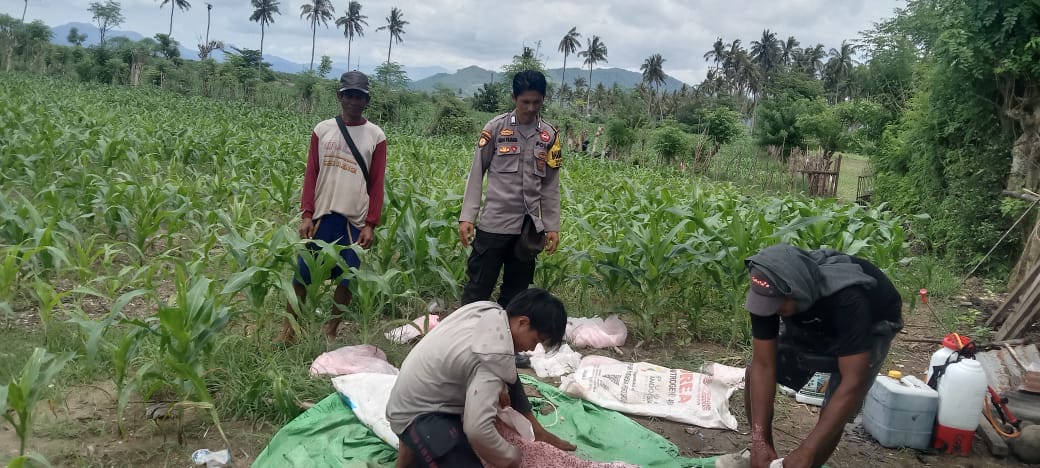 Bripka Andi Prabata menyampaikan motivasi kepada para petani agar memaksimalkan pengelolaan lahan mereka. “Pemakaian pupuk bersubsidi secara teratur sangat penting untuk mendukung pertumbuhan tanaman jagung yang maksimal. Kebersihan lahan dari hama dan rumput juga harus menjadi perhatian utama agar hasil panen optimal,” jelasnya.